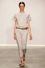 Newcomer Domenico Cioffi followed with a selection of true summer looks. He showed wide tops and dresses with line details and striped prints. He even added matching sun caps and styled his looks with chunky cuffs, fringed sandals, cross earrings and eye-catching cool sunglasses which he designed himself. Quite a lot of different styles united! Therefore a clean grey-ish playsuit and a sober trenchcoat inspired design were the strongest items in the bunch.