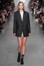 After Donna Karan went out with a bang last season fresh faces at the DKNY designer’s desk Dao-Yi Chow and Maxwell Osborne took over. Yesterday they presented their first collection for the brand inspired by what is perhaps Donna Karan’s most iconic fashion piece: the pinstripe power suit. They kept things very clean and simple, which gave the DKNY girl a super sophisticated and modern update. In a monochrome palette (we spotted just two touches of blue at the end of the show) the designers introduced a boxy blazer (worn by Maartje Verhoef) as a dress, a pinstriped pencil skirt matched with a basic white Tee and the most plain white playsuit. Simple, plain, elementary, yet never dull. Chow and Osborne made sure of that by sending out multiple variations of that particular power suit. The jackets double breasted and roomy. The dresses layered and asymmetric. Sheer T-shirts slowly transformed into a selection of sheer midi finale dresses. Loose hanging straps and chic simple clutches were the only accessories of the show. Were there enough new elements to give DKNY it’s own identity without the label’s founder on board? We’re not sure yet. But this was a show stuffed with youthful, commercial looks any NYC-girl would want to wear. No doubt about it. And while her autobiography hits stores this week Donna Karan herself approved of this collection by attending from her front row seat. New beginnings just had a great start.