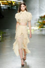 Laura and Kate Mulleavy grew a lot of sunflowers over the summer. Sunflowers that attracted a lot of bees, which ultimately led to their bee-inspired summer collection. Looking at the clothes from a distance you’d probably just see a bunch of delicate and beautiful dresses, but taking a closer look you could see the bee inspired details. Like the honeycomb-ish layering on a piece of tulle, a beehive bodice decoration and lots of floral embroideries. Details on a selection of feminine and delicate cocktail and evening dresses with a focus on the shoulders. An abundance of jewelry (including large earpieces worn in just one ear) added extra grace. But it wasn’t all dreamy and sweet. The designer sisters added some tough touches too, in the shape of leather belts and boots. The last look: a floor sweeping wedding gown for the bride to bee. Then it was time for sparkling rose drinks and rooftop dances at the Jane.