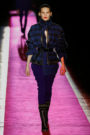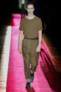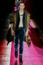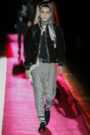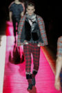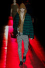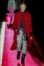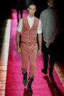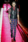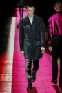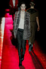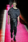 “I’m always attracted to the elegant man, but I’m always kind of a mess,” said Haider Ackermann backstage ato WWD after his his wild patchwork of a show. The collection had a punk feel, with magnified houndstooth fabrics patchworked with black leather for vests and jackets; a long, dark red military style coat, and plaid, checked or striped trousers, some with tartan tops knotted around the waist. Velvet played a starring role, patched together with leather or wool for a jacket or adorned with devoré fabric with ragged edges or more houndstooth checks.