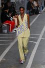 Sports & Chic came out in a pair of denim shorts and a velvet top and a pair of velvet pants with a denim jacket. In black sport leggings paired with a long lace skirt on top of it. In white sport leggings with a long floor sweeping gown over it. In a suit jacket that had “OFF” printed onto it in neon letters. A few looks were really just sporty as the finale of snake prints looks wasn’t necessarily sporty nor chic. It did make a bold statement.