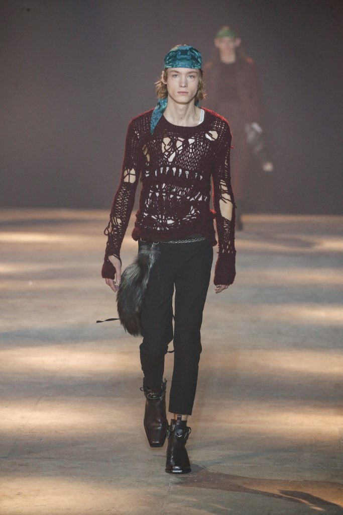 Ann Demeulemeester was gloomy yet quite colourful at the same time. The brand’s androgynous male models looked like they got dressed exactly how they wanted to, not carrying about what others might think or what would be appropriate, what would fit their gender or what would be in trend. They sported shiny silk printed robes and blouses, airy, off shoulder knitwear sweaters, statement coats, fur stoles and shiny head scarves. Their careless attitude made them look cool, even apart from the clothes they wore. If there’s a lesson to be learnt here it is to be a little more creative. Or as Sébastien Meunier put it: “There’s a uniformity in garments today and I’m sure there are people who want to dream a bit more.”