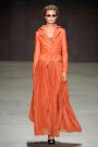Tony Cohen’s show was a 24/7 adventure. As the sun came up his first model came up wearing an orange shaded ensemble, including a pleated cotton maxi skirt and a leather biker jacket. After a few more looks in earthy tones, the color palette changed into nude, grey and later on black and white. Then Tony introduced a series of the brightest neon dresses, which gracefully moved at the pace of the models’ walk. After a short pause it was time for the evening wear to shine. As a full moon shined on the runway models appeared sporting glittery, asymmetrical pieces for a night out in style. Flared pants were combined with 70’s wedge shoes. Duo colored draped dresses, like we saw last season at Tony Cohen, made the models look elegant and party proof. Long evening dresses were vamped up by airy trains following the models in the air, throughout the night.