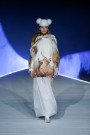 Supermodel Bregje Heinen brought even more of that international feeling to the evening as she opened the show in a winter white look. The white, cream, silver and shiny looks that followed all had a clear futuristic touch to them, matching the show’s theme. Helmets and other types of crazy head gear (with Micky Mouse ears, antlers and horns) added to that feeling, as did enormous pieces of metallic jewelry.