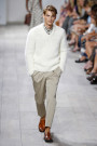 Flowers abounded — pristine daisy appliqués on all-white looks; a camellia print on a pajama; big geraniums embroidered on indigo mikado. Kors delivered on the sporty side of his equation with cropped chinos, one pair worn with a shirt and gray cashmere pullover with matching corsage; strong outerwear, and his grounded footwear. This included a rugged sandal set on a prim, low heel. The style’s name, at least on Sunday morning: the Jesus Kitten.