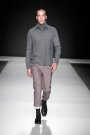 Yet like in most menswear shows for fall 2012 we’ve seen so far a big part of the collection was about the suit. They came in shades ranging from lightgrey to black, as did most of the collection. Towards the end, as the music changed from a monotone sound to a more cheerful tune, Hyun added some color (a red checked scarf a pair of pants and a coat).