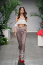 This translated to dreamy, romantic and ultra feminine looks. Dusty pink and powder hues were alternated by touches of red, yellow and emerald. The off shoulder tops, the parted, wavy hair and natural make-up added to the overall elegance and classic feel of the collection. Airy and shiny fabrics, floral appliques and embroideries turned the pants into extravagant showstoppers. Wearing pants was never as ladylike as it is with Anbasja Blanken.
