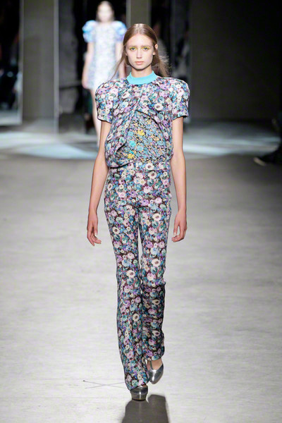 Different periodes melted together; sixties flairpants and floral prints clash with all American football influences, which include strong shoulders and sportswear inspired details.