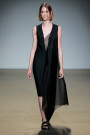 In an interview last year David Laport said to be focusing on art. “The more experimental the job, the better”, he stated on Idependent Fashion Daily. So today’s collection, inspired by Laport’s fascination for insects, was surprisingly wearable. He beautifully mixed light and heavy fabrics into elegant, ladylike, asymmetric creations. Rigid tops and sheer, airy skirts and vice versa. Pleated parts and lace (made in Austia) details. Mostly in blacks and whites with touches of turquoise, soft pink and blue. Feathers, tulle and a specially treated type of nylon which can create larger volumes, gave the looks a dreamy ballerina association, while the patent leather parts kept them grounded. Although, it was as if the last angel, dressed in a sculptured, sheer, feathery black creation, could have just floated off of the runway.