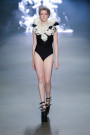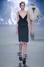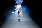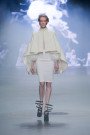 Not only do those towering high fashion shoes make a more dramatic catwalk image, they can be painful and dangerous too. Tonight Dennis Diem showed just how dangerous they can be as he sent out his models on sky-high black shoes. After a few tumbling and stumbling models one of the girls really fell flat on her face. It gave everyone in the audience a heart attack, yet turned out to be an act (what a relief!). It drew our attention away from the clothes for a brief moment, but luckily Dennis’ creations, inspired by opium and the movement of smoke, were just so gorgeous we couldn’t keep our eyes off of them. From a wall of smoke models appeared in a selection of (mostly) monochrome dresses with a slight rebellious touch. Sexy corsets (Diem’s signature) were attached to pencil skirts and floor sweeping dresses with lots of tulle to create that extra romantic vibe. Cashmere capes added some extra drama and shiny sequins gave the looks a dreamy touch. With a focus on shoulders and hips the designs were even more powerful. The fairytale was complete once Dennis received his applause while walking the catwalk accompanied by two of his princesses dressed in impressive off white dream gowns.