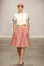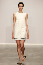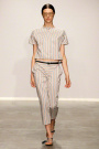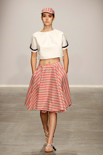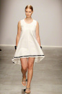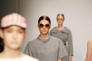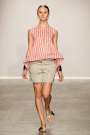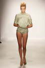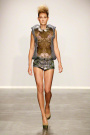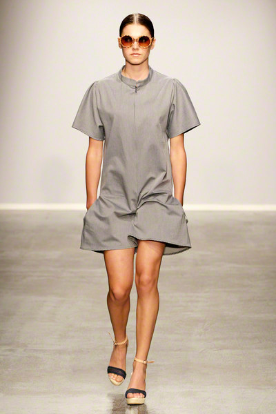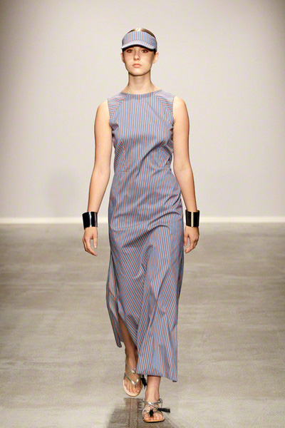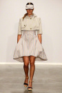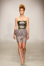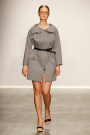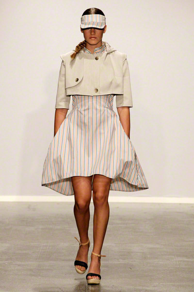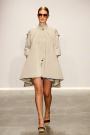 Newcomer Domenico Cioffi followed with a selection of true summer looks. He showed wide tops and dresses with line details and striped prints. He even added matching sun caps and styled his looks with chunky cuffs, fringed sandals, cross earrings and eye-catching cool sunglasses which he designed himself. Quite a lot of different styles united! Therefore a clean grey-ish playsuit and a sober trenchcoat inspired design were the strongest items in the bunch.