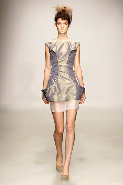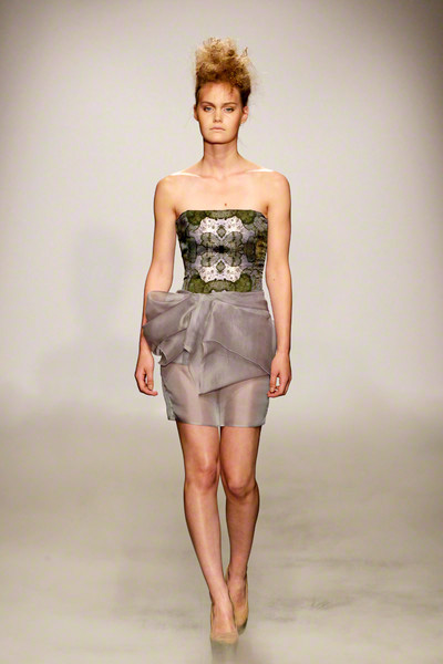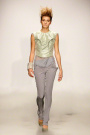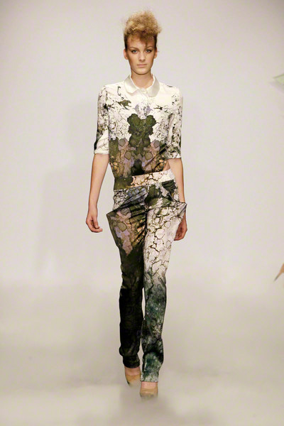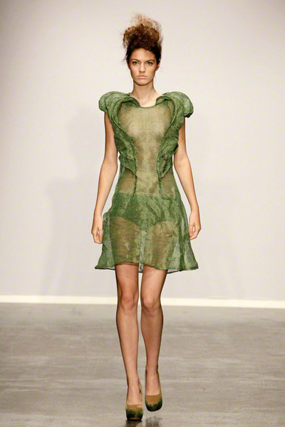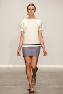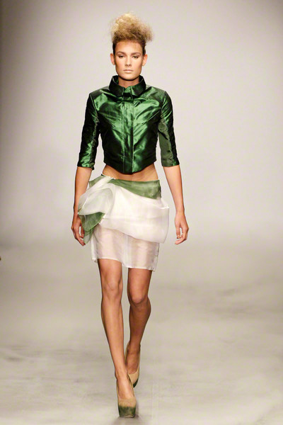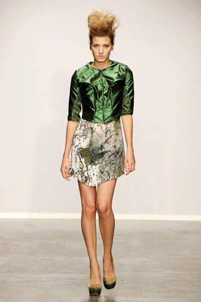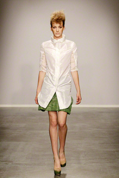 Dorhout Mees kicked off with a small collection of womenswear. Dresses with strong shoulders, structured skirts and blouses combined with tiny hotpants formed playful elegant looks. Esther Louise Dorhout Mees used nature inspired prints and shades of (mos-)green and white. Several fabrics looked shiny and somewhat metallic, as other sheer ones stressed the airy and dreamy aspect of the collection.