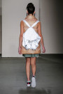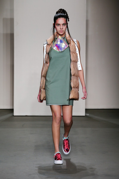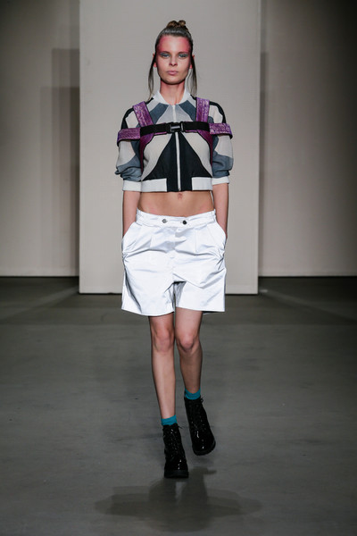 After watching a kaleidoscopic video with a virtual model talking about ‘little fluffy clouds’ and a moving backdrop Jacob Kok sent his models out on the LAB runway. They appeared sportive and modern in their structured, colorful pieces. They sported braided buns, backpacks and platform sneakers, details that gave away Koks eye for styling and accessories. Their hands in the pockets gave the girls a streetwise attitude. The link between fashion and technology, in which lays Koks focus, was visible in every single look. From the metallic sneakers to the shiny cream dress and some of the outstanding jewelry pieces. A short collection for Jacob Kok, but it impressed nevertheless.