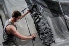 Ever experienced a massive storm? Well at Jef Montes you were in for a treat! No straight up catwalk show here, the young designer set up a fashion experience. An experience for himself as well as for the audience. Jef Montes decided to create the opening outfit of his brand new collection Tormenta (storm) in front of his guests. A chance for us to take a look inside his design studio, see how it’s done. Not your average workplace we tell you! Like a true storm Jef Montes raged around his experience space using all different types of chemicals to create his design. We got to witness all design phases; epoxy at first and finally black ink to cover it all; the dress, the space and himself. The result? Some fascinating designs shown against an eerie backdrop representing Jef Montes’ thought on life in the here and now as well as the hereafter. We’re blown away (by the storm). Quite the experience.