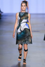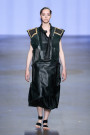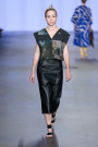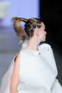 Right before the show Marga didn’t want to reveal too much about her collection ATELIER yet. She did say it would be more wearable than before. Something we didn’t immediately feel as the first five looks appeared. They were four square shaped looks, almost like white origami papers cut, creased and crumbled. Worn with ‘shoes’ made out black tape and architectonic hair they cut an impressive figure. As the show carried on we could see the designs being worn in real life. Probably not in the tram to work, but they’ll sure do well on a fancy cocktail party. With each piece Marga gave a little bit of an insight in her atelier. Starting off with raw experimental model, evolving into wearable fashion. Leather dresses in brown, bright blue and army green were followed up by batik-like dresses and digitally printed pieces. Combined with heavy vintage leather the softer arty printed parts formed a fine series of contradictory looks.