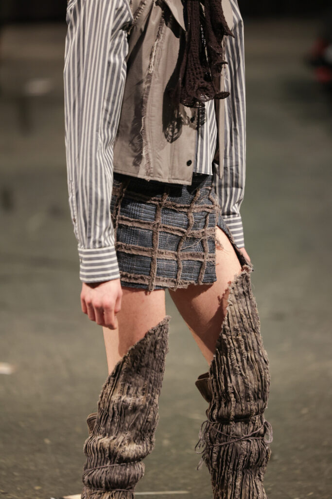 The footwear was ranging from chunky black loafers that exude an air of casual insouciance to knee-high lace-up’s and heavy black ankle boots, adding a distinctive edge to their ensembles. A pink bedazzled Mistica sneaker followed by a line-up of hardcore attire. A perfect match with the paper outfits.