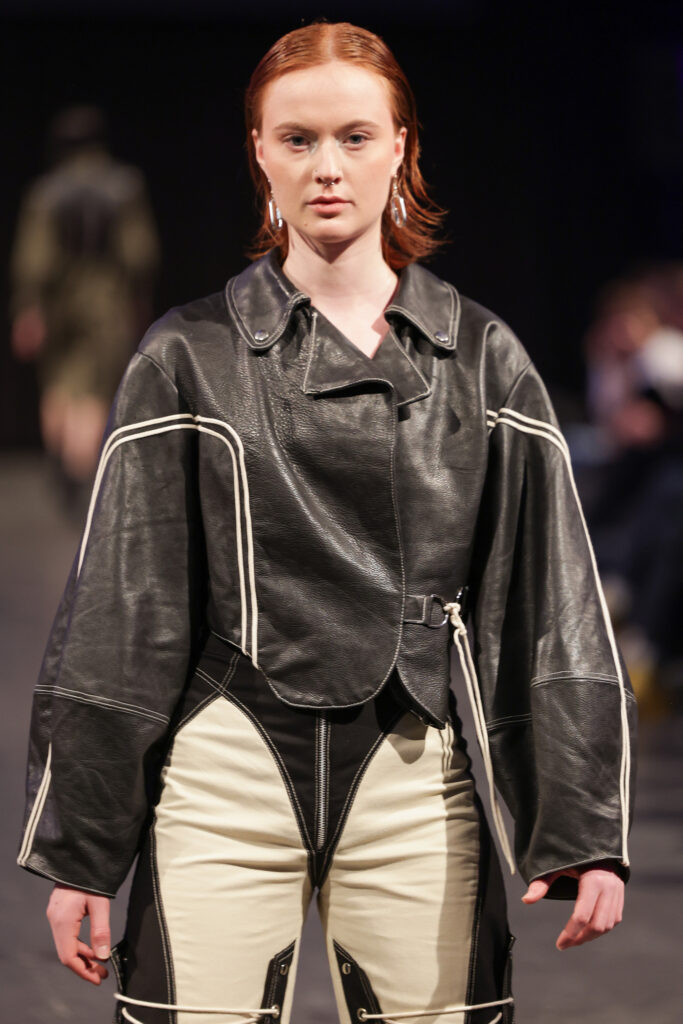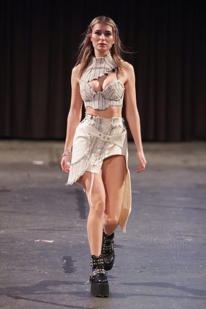 Embarking on a creative journey that weaves together four distinct facets of her personal identity as a Moroccan woman, Yousra displayed a technically immaculate collection drawn from her upbringing in a restrictive Islamic household. Influences from Berber Folklore people in Morocco, Moroccan street style fashion, the vision her parents held for her – a more conservative and modest appearance, and lastly her own sartorial choices. Sensual lingerie against parental modesty, Berber goat skin traditions, and Dutch-imposed stereotypes create a dynamic tension between concept, as well as material and texture choices. Using Geert Wilders’ notorious 2014 “Minder Marokkanen” speech as the backdrop of her show, her collection K*TMAROKKAAN withholds a powerful statement that, similar to her designs, won’t go unnoticed.