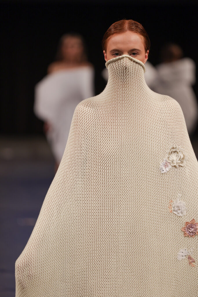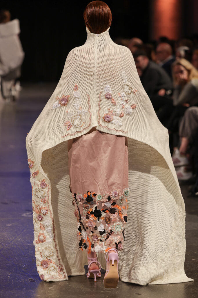 MARTAN’s Spring-Summer ‘24 collection was created entirely from upcycled hotel linens and showcased a realm of imaginative potential that extends beyond the conventional confines of fashion production. A nod to nautical seemed to be the red threat that weaved itself onto the catwalk.