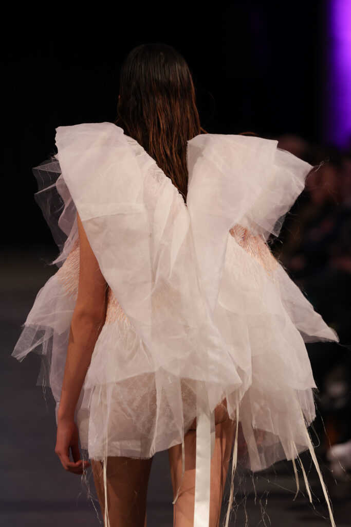Embarking on a creative journey that weaves together four distinct facets of her personal identity as a Moroccan woman, Yousra displayed a technically immaculate collection drawn from her upbringing in a restrictive Islamic household. Influences from Berber Folklore people in Morocco, Moroccan street style fashion, the vision her parents held for her – a more conservative and modest appearance, and lastly her own sartorial choices. Sensual lingerie against parental modesty, Berber goat skin traditions, and Dutch-imposed stereotypes create a dynamic tension between concept, as well as material and texture choices. Using Geert Wilders’ notorious 2014 “Minder Marokkanen” speech as the backdrop of her show, her collection K*TMAROKKAAN withholds a powerful statement that, similar to her designs, won’t go unnoticed.