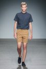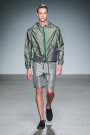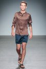 Fresh faced male models walked the runway at Mevan Kaluarachchi’s show this week. They sported the young Sri Lanka born designer’s perfectly tailored collection, which contained just about every piece a man needs during summer time. Like sand colored shorts, denim shorts and even light blue colored shiny shorts. Like slouchy striped pants and narrow pleated pants. Like (slightly transparent) white Tees and longsleeves. Like a cardigan with a baseball fit and a sportive checked jacket with leather details. Like short leather jackets, denim jumpsuits and shiny hooded jackets. Like duo colored sleeveless tops and white shirts. Like a decent leather bag, a cool pair of sunglasses and some casual sandals, all given the Mevan twist.