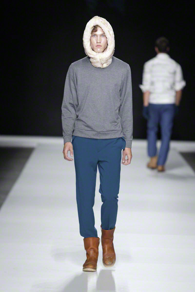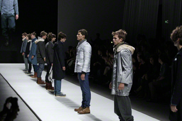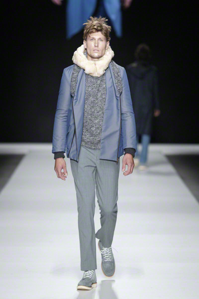 The designs indeed looked like you could conquer any weather in them. Thick woolen coats, perfect pants tucked in shoes, and great jackets with hoodies and fur details. Shades ranged from multiple blues and greys to green (some of them slightly shiny).