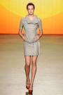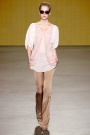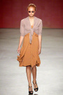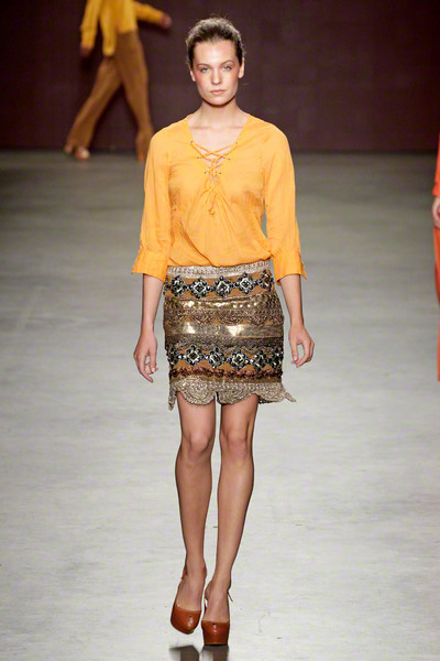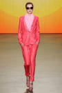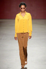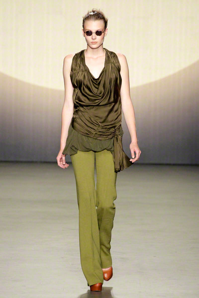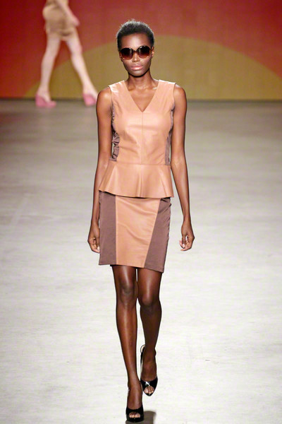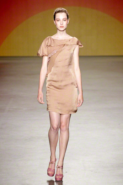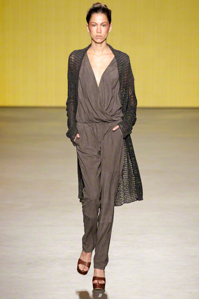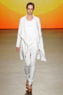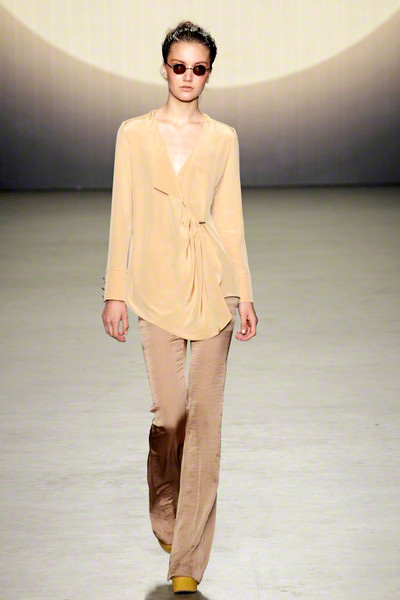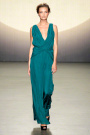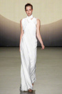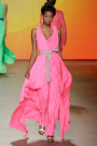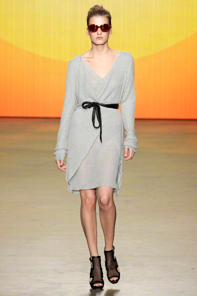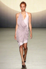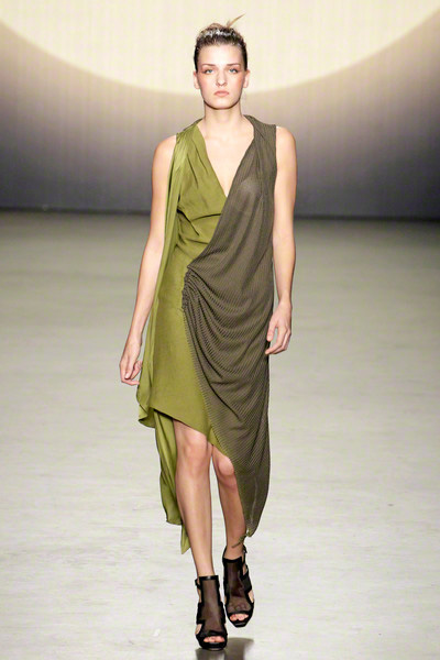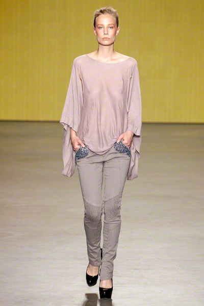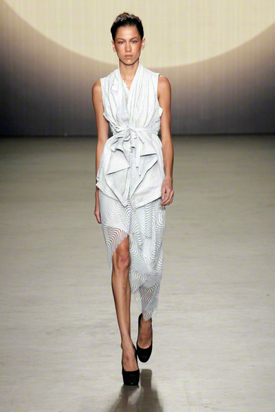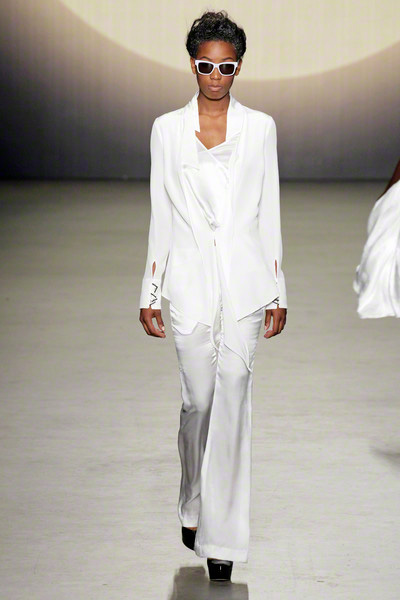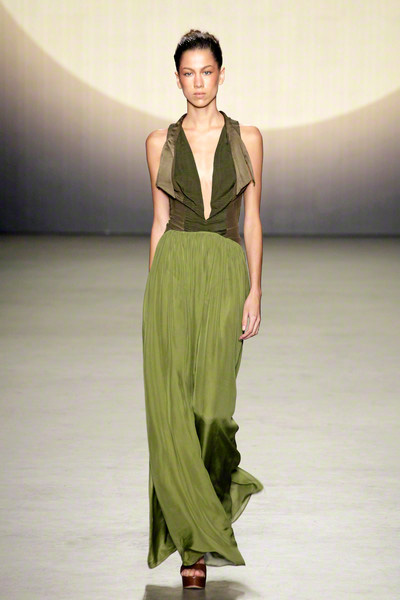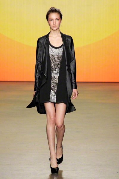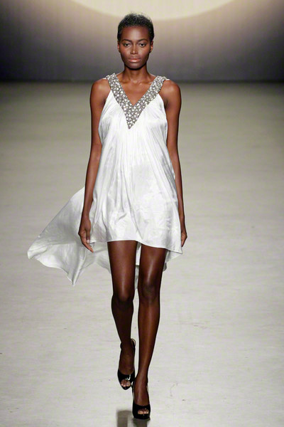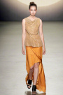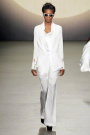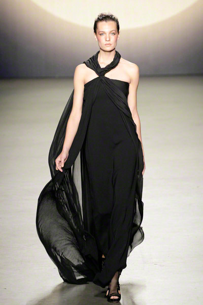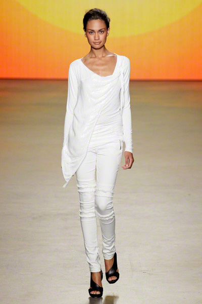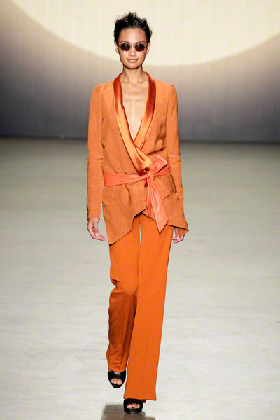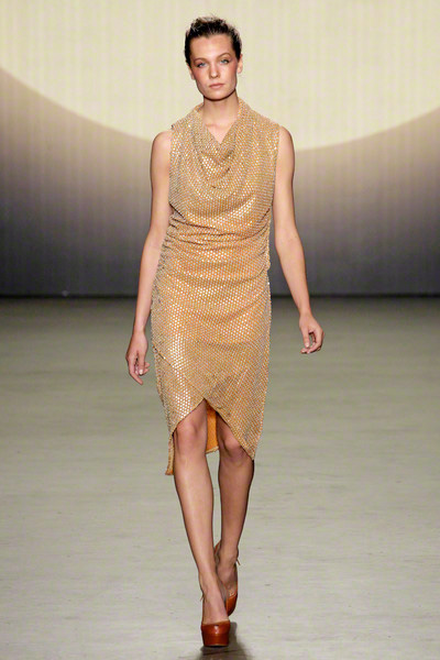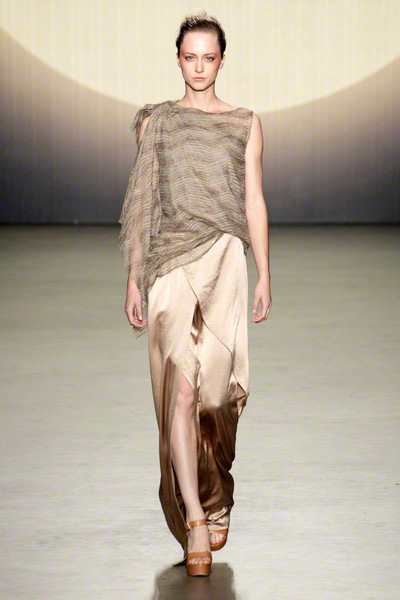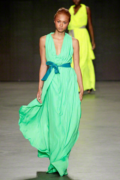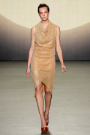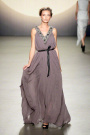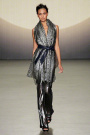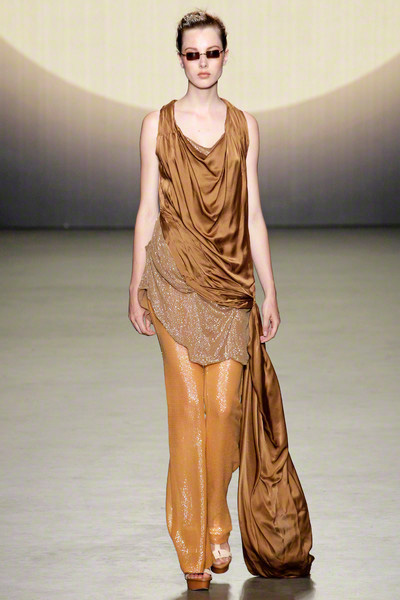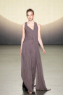 Tony Cohen’s show was a 24/7 adventure. As the sun came up his first model came up wearing an orange shaded ensemble, including a pleated cotton maxi skirt and a leather biker jacket. After a few more looks in earthy tones, the color palette changed into nude, grey and later on black and white. Then Tony introduced a series of the brightest neon dresses, which gracefully moved at the pace of the models’ walk. After a short pause it was time for the evening wear to shine. As a full moon shined on the runway models appeared sporting glittery, asymmetrical pieces for a night out in style. Flared pants were combined with 70’s wedge shoes. Duo colored draped dresses, like we saw last season at Tony Cohen, made the models look elegant and party proof. Long evening dresses were vamped up by airy trains following the models in the air, throughout the night.
