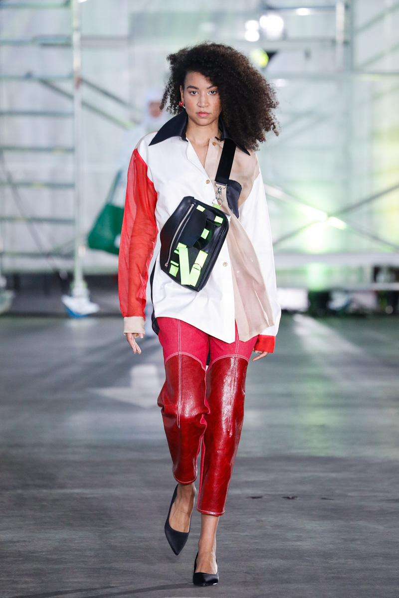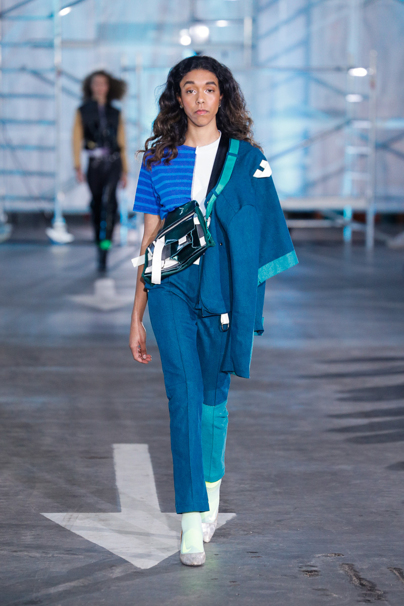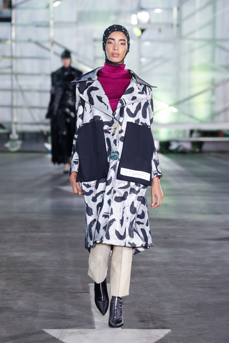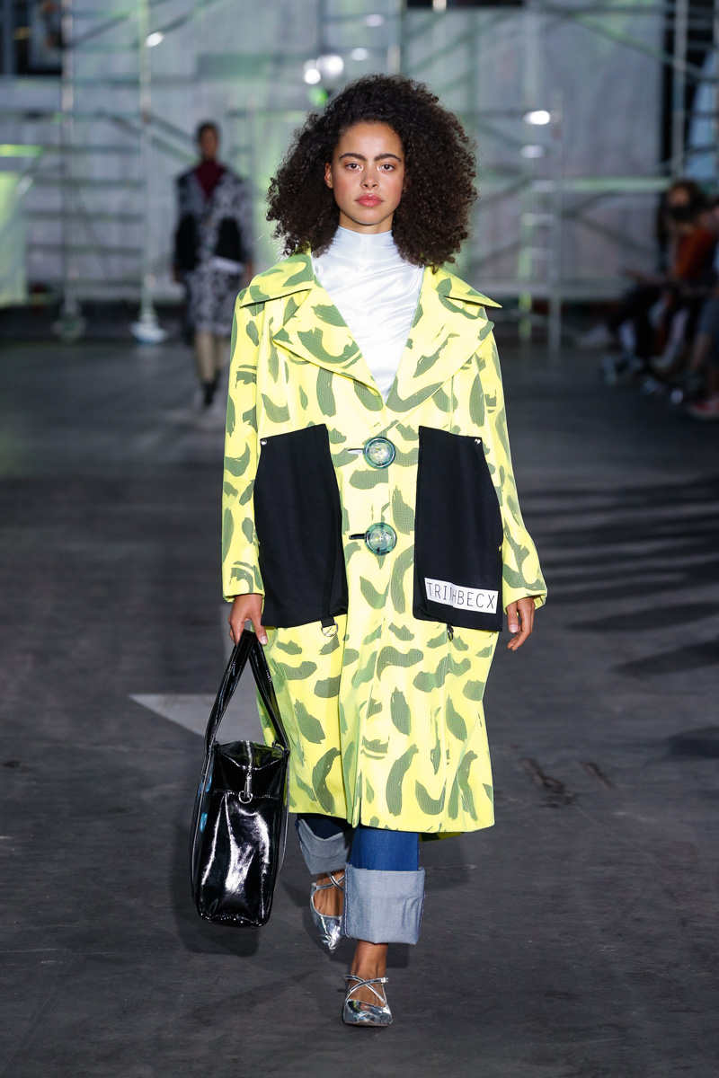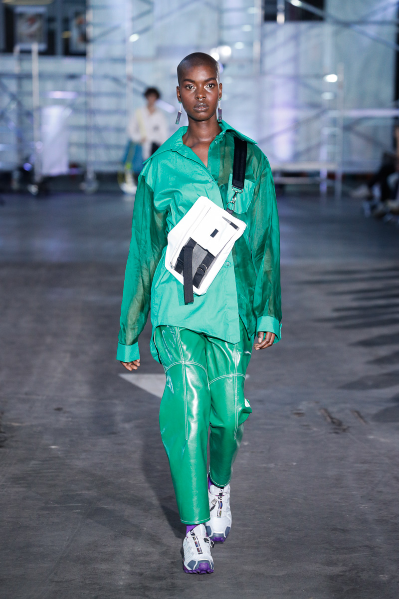 You couldn’t tell all of this by watching the show. Cool kids were rocking colourful, sporty looks with a twist. Like the green look worn with purple sneakers that opened the show, made out of three different materials (both sheer and heavy leather like). Patchwork formed a big theme for Trinhbecx as the third look made of pastel shaded parts, sheer logo printed shorts and an animal inspired graphic print showed very clearly. An oversized white colored trenchcoat worn with a head wrap was followed by a pinstripe suits cinched at the waist by a big white belt. The graphic print returned on two fully printed coats with big pockets and buttons (utility mode on!). Sporty trainers, statement jewelry (piercings and colourful necklaces) and cool but practical bags (fanny packs and shoulder bags) brought everything together. An all black leather-ish, Matrix inspired outfit (long heavy coat and again a head wrap) concluded the show.