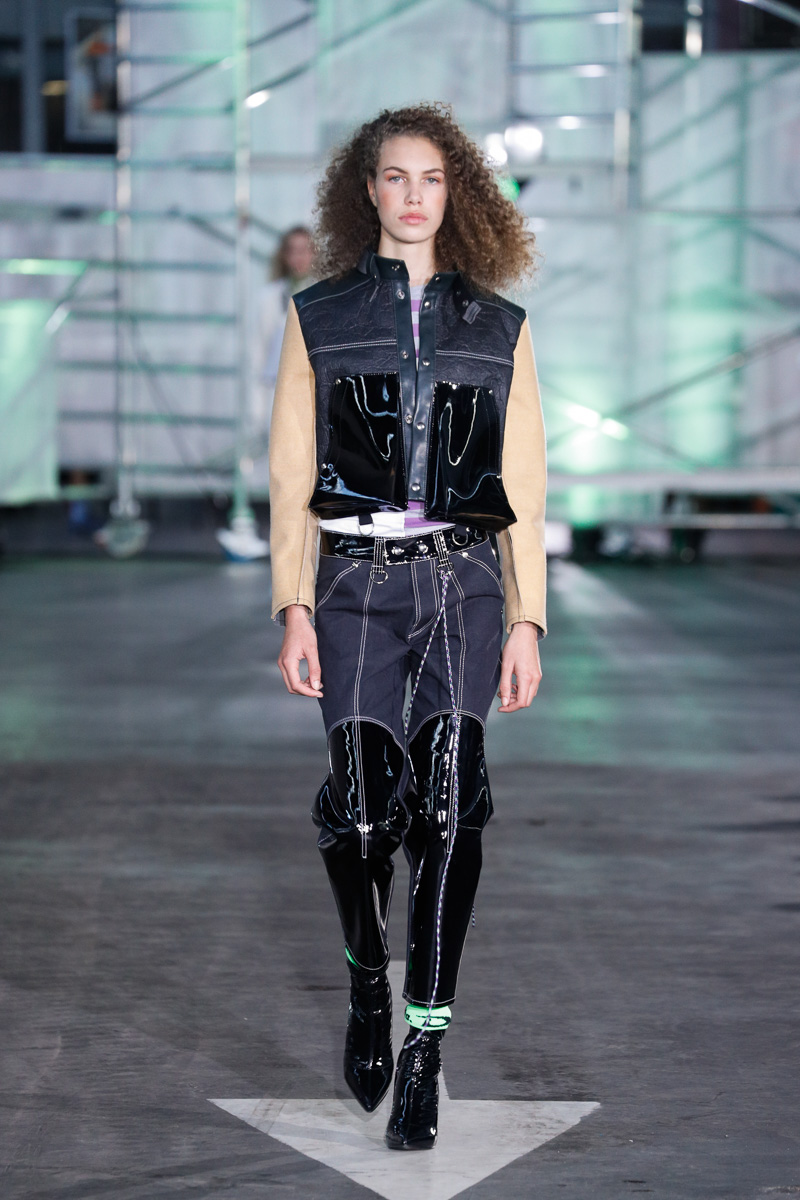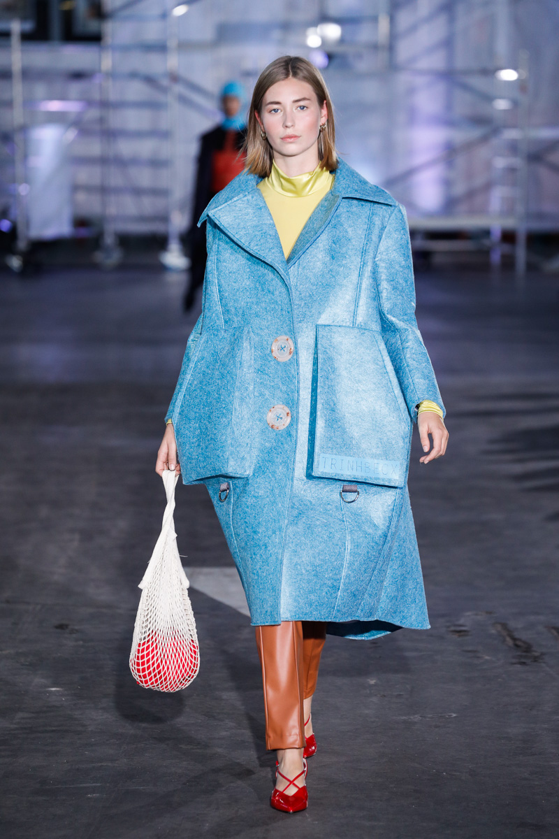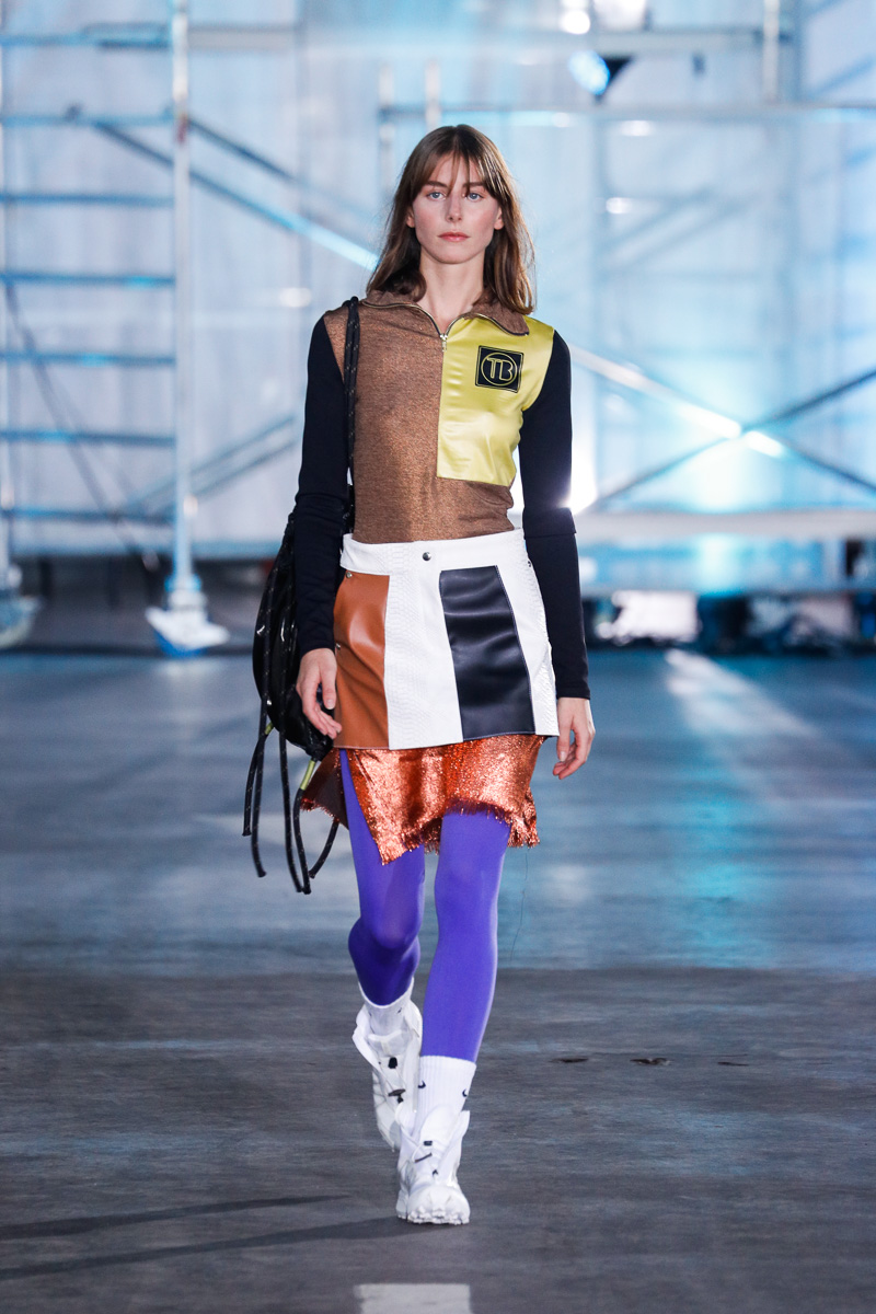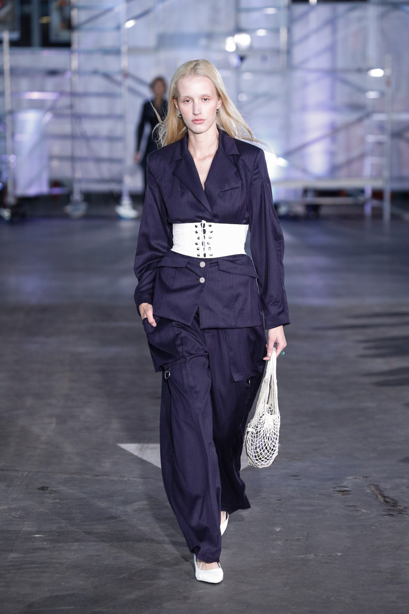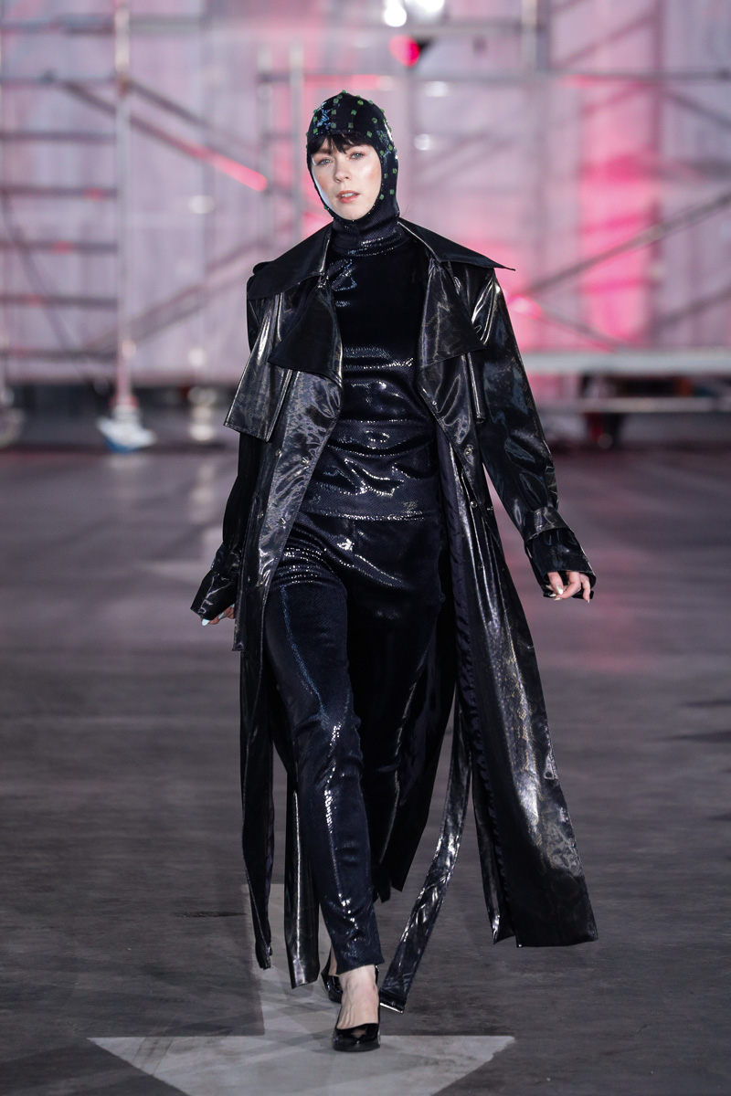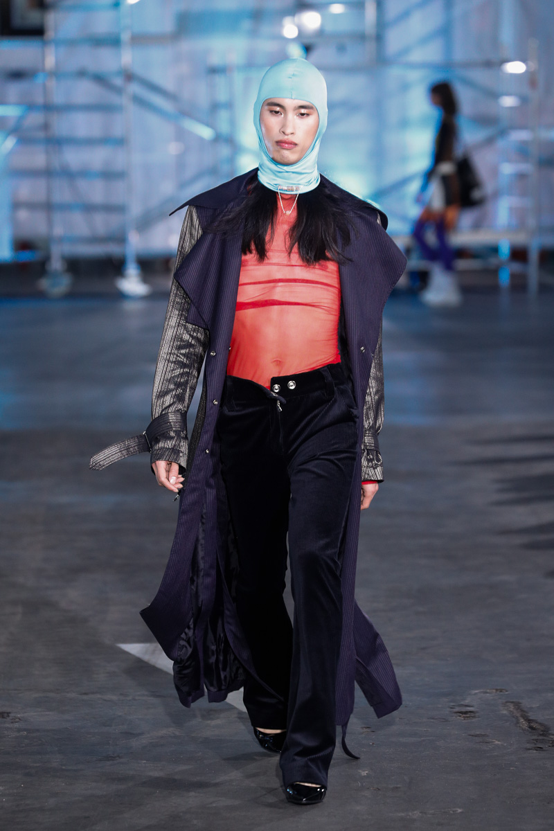 You couldn’t tell all of this by watching the show. Cool kids were rocking colourful, sporty looks with a twist. Like the green look worn with purple sneakers that opened the show, made out of three different materials (both sheer and heavy leather like). Patchwork formed a big theme for Trinhbecx as the third look made of pastel shaded parts, sheer logo printed shorts and an animal inspired graphic print showed very clearly. An oversized white colored trenchcoat worn with a head wrap was followed by a pinstripe suits cinched at the waist by a big white belt. The graphic print returned on two fully printed coats with big pockets and buttons (utility mode on!). Sporty trainers, statement jewelry (piercings and colourful necklaces) and cool but practical bags (fanny packs and shoulder bags) brought everything together. An all black leather-ish, Matrix inspired outfit (long heavy coat and again a head wrap) concluded the show.