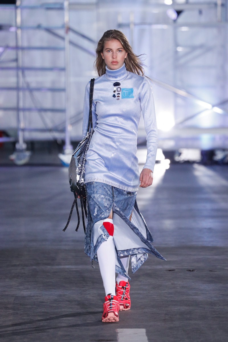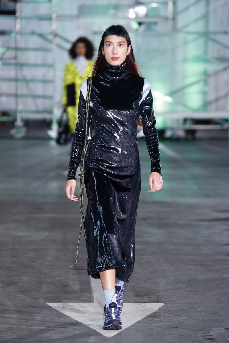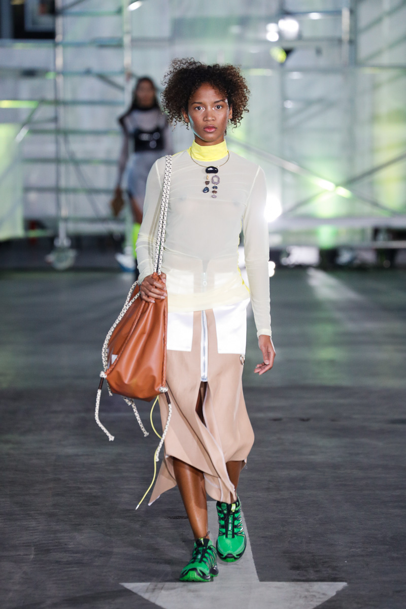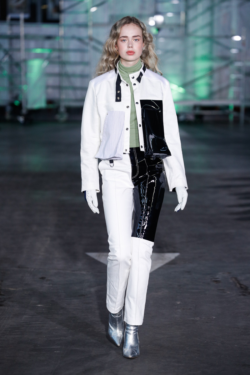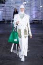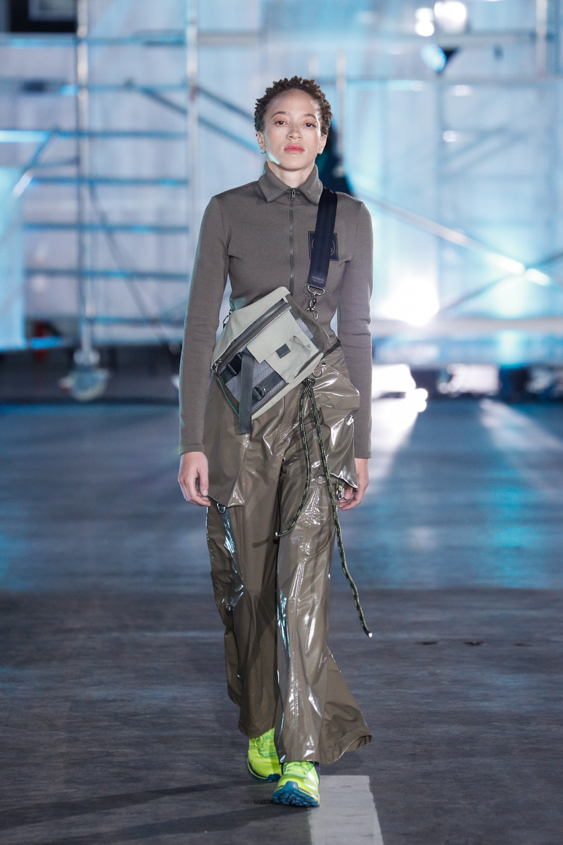 You couldn’t tell all of this by watching the show. Cool kids were rocking colourful, sporty looks with a twist. Like the green look worn with purple sneakers that opened the show, made out of three different materials (both sheer and heavy leather like). Patchwork formed a big theme for Trinhbecx as the third look made of pastel shaded parts, sheer logo printed shorts and an animal inspired graphic print showed very clearly. An oversized white colored trenchcoat worn with a head wrap was followed by a pinstripe suits cinched at the waist by a big white belt. The graphic print returned on two fully printed coats with big pockets and buttons (utility mode on!). Sporty trainers, statement jewelry (piercings and colourful necklaces) and cool but practical bags (fanny packs and shoulder bags) brought everything together. An all black leather-ish, Matrix inspired outfit (long heavy coat and again a head wrap) concluded the show.
