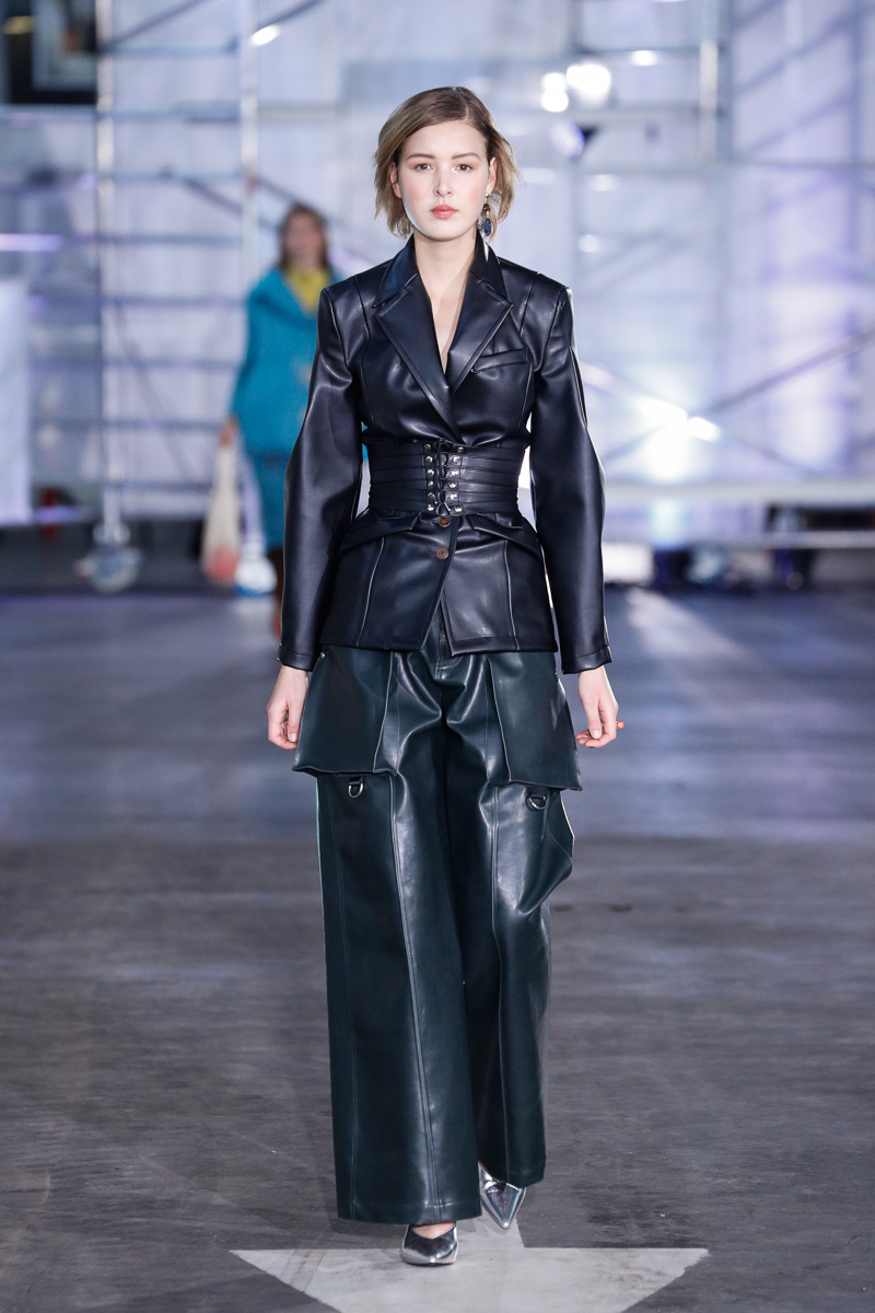 The show, which is part of the Dutch Sustainable Fashion Week was scheduled as a “Talking Trash” show. And they couldn’t have picked a better designer duo for this event. Trinhbecx spoke of how they’d been looking for sustainable alternatives to existing materials such as leather and cotton. On their mission to deal with waste more consciously they came up with materials like viscose made from coffee grounds, leather made out of plant cells, and fruit waste turned into (XL) buttons.