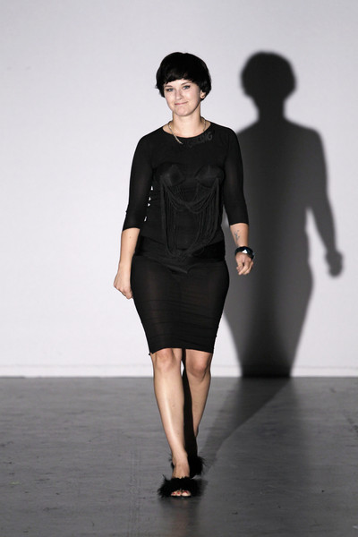 The models had shiny white lips and did some crazy feminine poses before they started walking the runway, a hand kiss or one leg in the air, for instance. Their black dresses had lots of details like fringes and ruffles.
