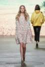 How this all translated into wearable womenswear looks, you wonder? Well, love was written all over the daring, sometimes revealing fabrics. Models paraded around in airy dresses, blouses and skirts made of silks and viscose crepes. Elegant designs mixed with sportive touches. Just as jackets, bombers and shorts added some contrast to the Love-themed collection. Floral prints and stripes met each other halfway. Beige suede pants and a leave printed green shirt formed a rather casual outing. As an off shoulder airy printed dress added some seductive sassiness. Richly decorated T-shirts and sweaters were given an admirable designer touch and the graphic SIS details were unmistakable.