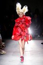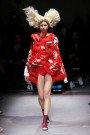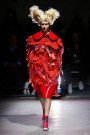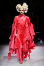A sea of red everywhere we could look. Choosing roses and blood as a theme Rei Kawakuno decided to stick to one color of poppy red. Different textures, structured shapes and extraordinary silhouettes created enough variation in the collection though. Fabrics being shredded, fringed, slashed up and raw edged. This were not clothes designed just to look pretty or set trends in. The designs somehow breathed some of the difficult issues happening in the world right now. Prettiness versus chaos and violence, roses versus blood. Kawakuno gave us all something to think about and not just whether we’ll be sporting shorts or culottes next spring.