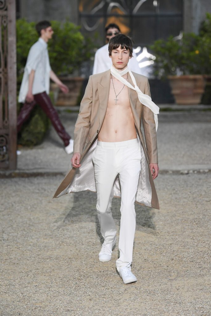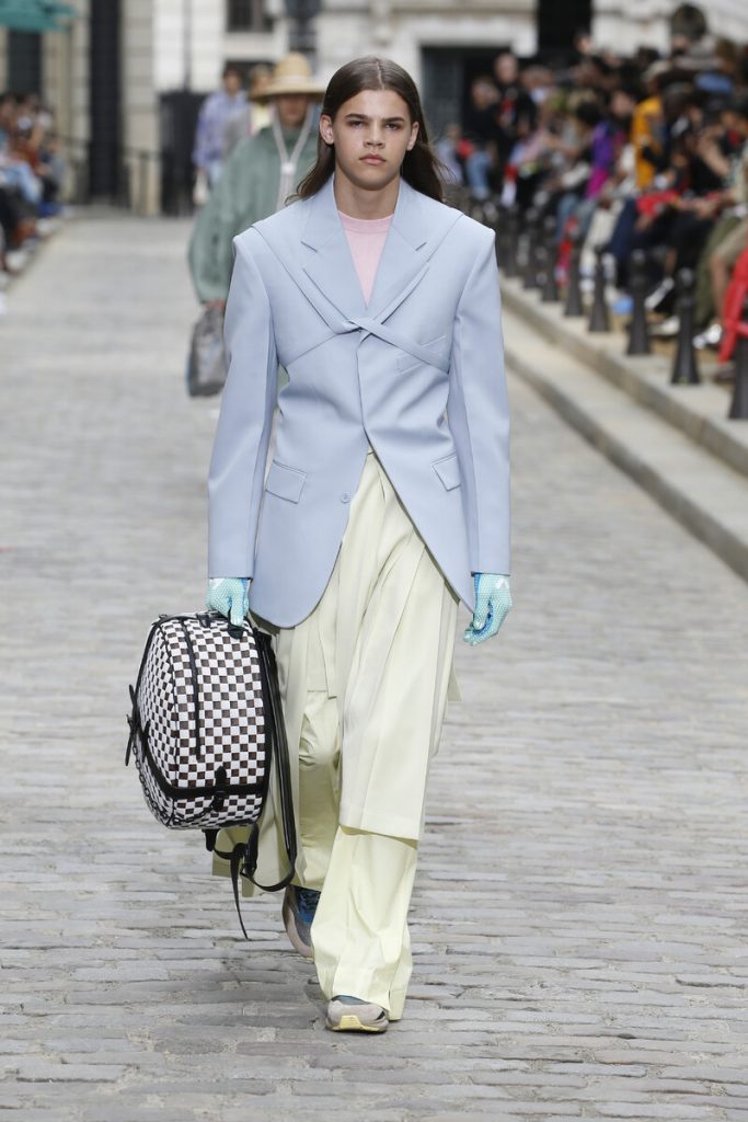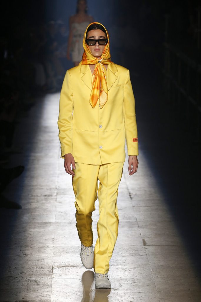 Men wearing dresses at the shows might have made some headlines five years ago. But menswear has changed so much the last couple of years there’s hardly a way to shock or surprise the audience anymore. And that is such a great observation. Rules have faded, boundaries have blurred, codes have shifted so that men can dress as freely as ever. Yes, we’re slowly moving from sporty and street to sophisticated and dressed up. Yet the new dressing up game is so much different than before. We’re getting seventies vibes (with lots of color, prints and a feeling of a louche love affair). Summer suits are allowed in just about any color except for the conservative navy and black. The ocean forms a big inspiration for many nautic boy (boat hat on, scarf around the neck) outings. Tunics and “midlayer garments” (quoting Vigirl Abloh) are the fits for relax/holiday mode. And then there’s a whole armory of gender bending looks and collections ready to change up the fashion game for guys just a little more. Also: let’s take a moment for the breathtaking Jacquemus show Simon Porte Jacquemus decided to hold in the middle of endless lavender fields in Aix-en-Provence. The ultimate escape for a 2020 holiday.