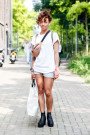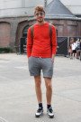 After a video full of tough, tattooed guys was shown, a DJ booth was driven on stage, a violin player stepped frontstage and tough (non tattooed) men with outstanding hairdos entered the catwalk. Their main wardrobe pieces were shorts and (hooded) coats. Shiny, checked, floral printed; the variations kept on coming, ranging in style from classic to sporty. Caps (worn backwards) sunglasses, socks with cut off toes, socks in sandals and leather bags added some fun touches. As the tattooed menswear designer made her statement with printed slogans like “Jesus saves the youth”, “Soul Rebel” and “Forever Young”.