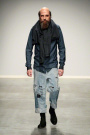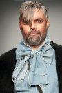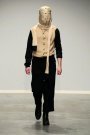For this show it was American criminal Black Bart that inspired her. She takes us back to 1877, when he was one of the most famous robbers in America. Black Bart was familiar for the notes he left after every robbery. But is was especially his style of clothes that got her. Because no matter what, he was always dressed properly, wearing a three- piece suit and a bowler hat. But to keep anonymous he always wore something under his bowler that covered his face. And that she translated in some extravagant headpieces, like a blouse worn as a huge scarf covering a models face or a huge collar raised until the eyebrows. We also saw the classic menswear suit, but in a rough way. Like a leather pea coat or a denim blouse. And you must have noticed there were real man walking down the runway, among which Ferry van der Nat. ‘Yes, I used older men as models, because they have this typical faces which suits so well with the story.’