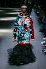 That rainbow check — and others — featured prominently in Saturday’s outing, which had a streetwear feel — and a retro one, too, what with the baggy shell suits, oversize zip-front jackets and check jackets that recalled Burberry’s chav days. Some of Bailey’s greatest hits, including shearling aviator jackets, capes and ponchos, military great coats and shimmery cocktail dresses, also beat a path down the catwalk.