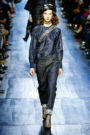 Next fall the glamazons of Balmain will be dressed in raw pelts with a stitched-together feel. One of the models looked particularly fierce in a black dress assembled from crocodile skins, a tribal-looking metallic lip ring tracing a gleaming line across her mouth. Other options included a shearling sleeveless coat, or a tunic top pieced together from panels of glossy ponyskin. “It’s all about a return to the forces of nature. I wanted to create strong Amazons. Women’s power today is extremely important, and I think I reflect that with this collection. It’s very feminist,” Olivier Rousteing told WWD backstage.