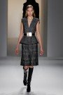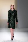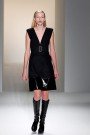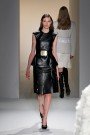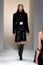 There was some Soviet influence in the fall-collection Calvin Klein presented. It was visible in the distinct military details, especially with the first few suits and dresses. Mostly in black and navy, they came in a faint plaid with vinyl inserts. Designer Costa made a powerful statement with lots of leather, accentuated shoulders on tailored pieces and several oversize silhouettes in stiffer fabrics. He countered this almost workmanlike sensibility with sexy bandeau tops that were wrapped in the back.