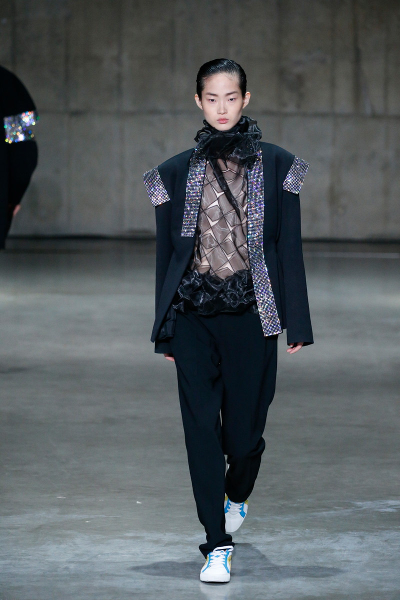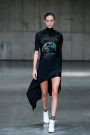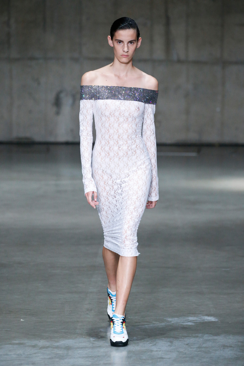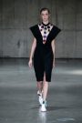 Shoewise there were sneakers and sex toy inspired pumps. No bags or jewelry were used; the clothes had enough details on their own. Especially since diamonds formed a theme too. They were there as a print on sheer evening dresses. And as real chunky and colourful stones on the necklines and chests of a few dresses and tops.