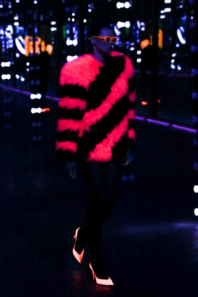 Ivory hues from head to toe (Blumarine) or a bold splash of fuchsia around the neck (Versace); the faux fur options are endless this winter. Play it safe (& sounds) with the brown colored coats at McCartney. Feel like color? Yellow hat and stola to match as seen at Loewe or orange shaded as presented at Valentino. Dare to take it a little further? Try Saint Laurent’s neon colored coats or Versace’s color blocking looks. You’ll make jaw drops and heads spin, fur real!