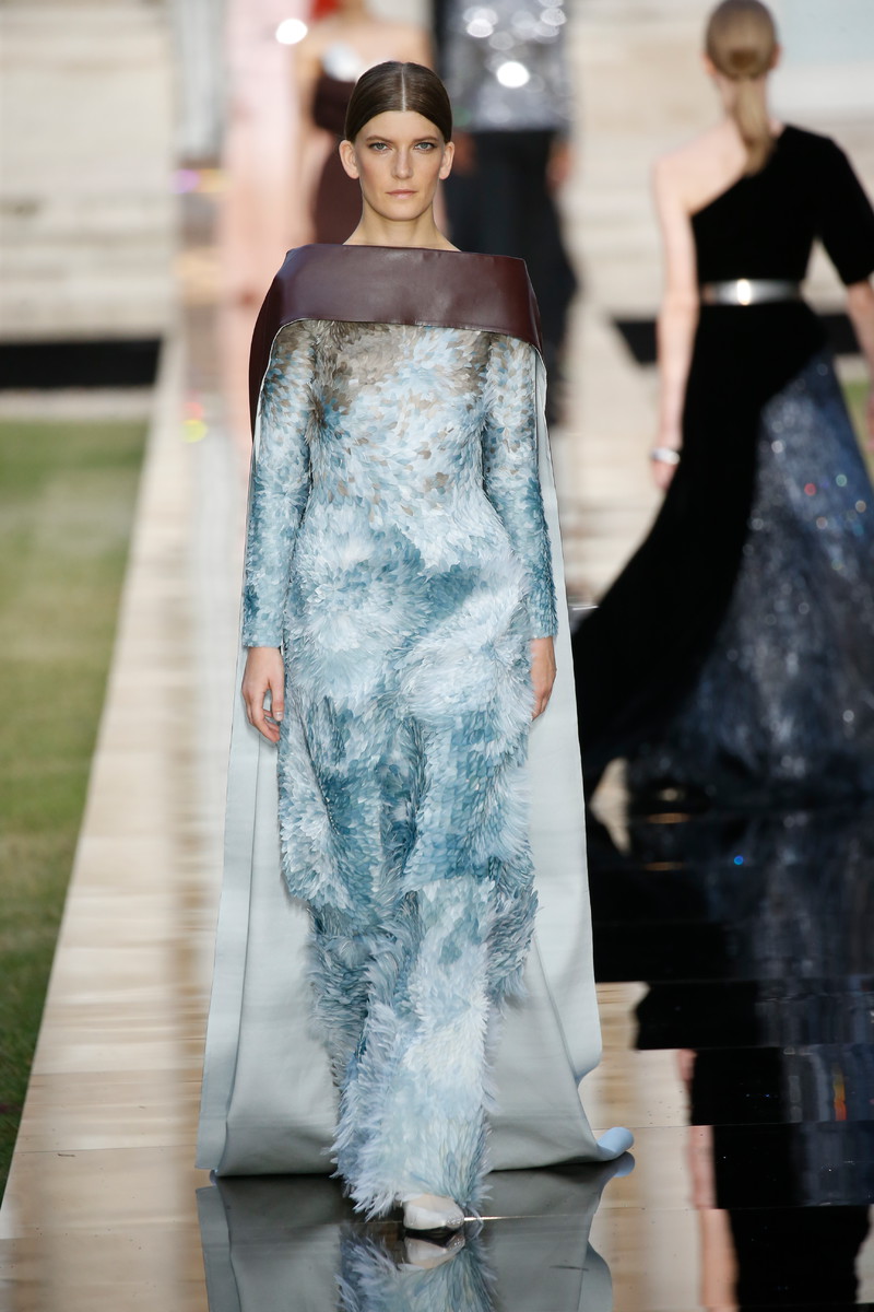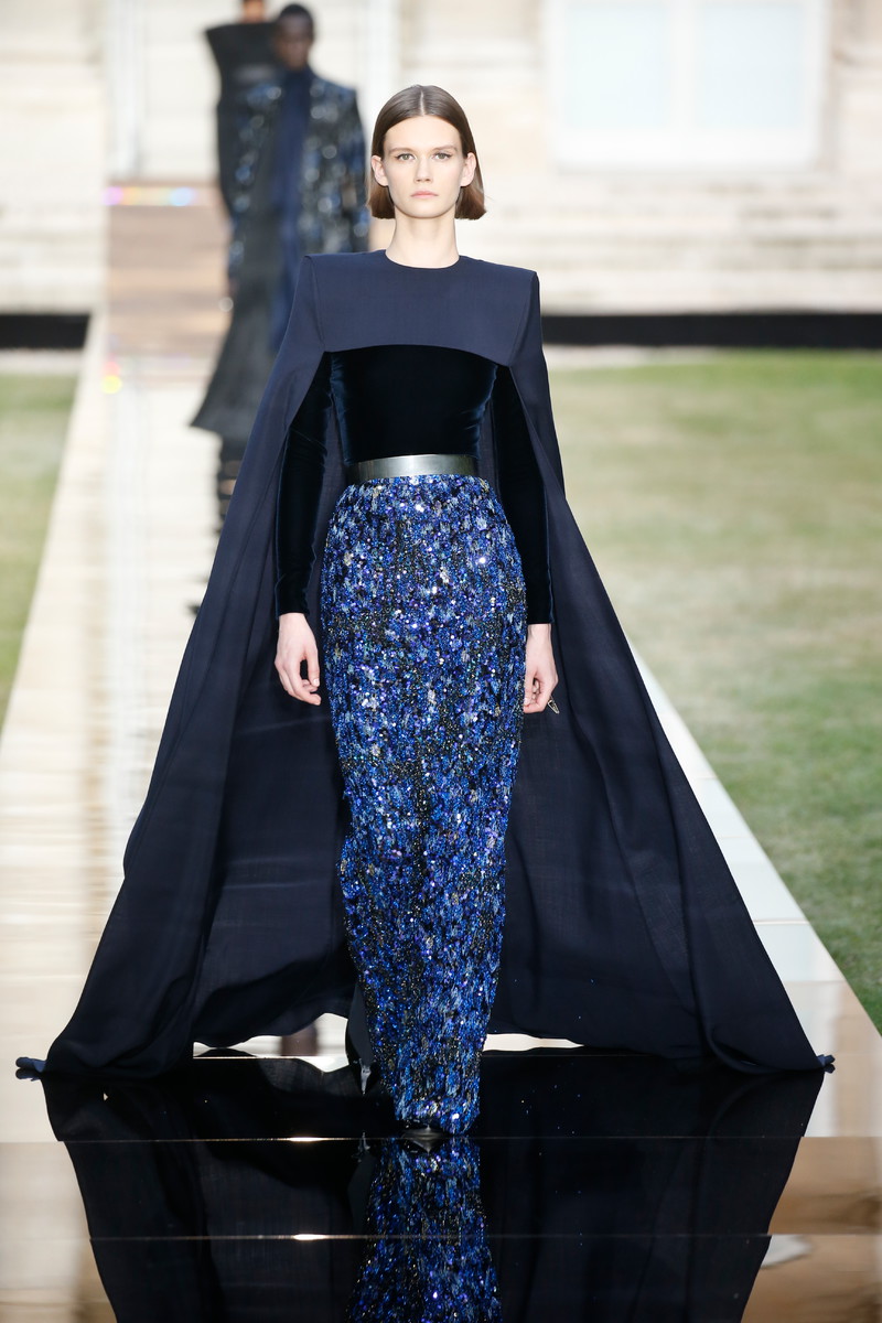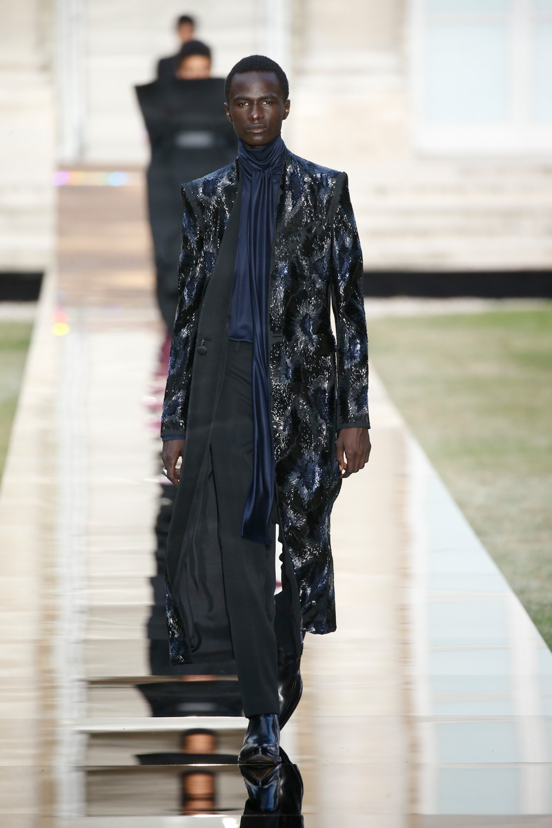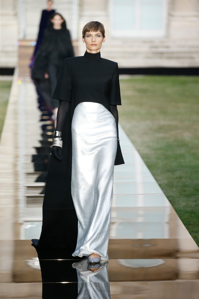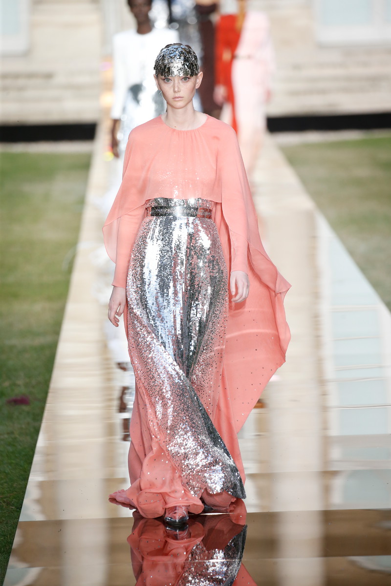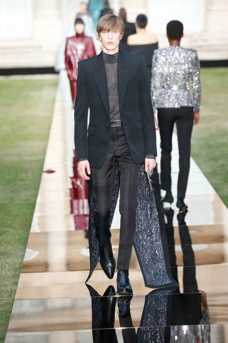 On a reflective almost liquid looking runway in the middle of the formal gardens of the Archives Nationales creative director Clare Waight Keller sent out her latest Givenchy couture collection. An ode to the master of the house, Monsieur Hubert de Givenchy with masterpieces in both mens- and womenswear. Pieces that were beautifully cut, slightly graphic and modern, even futuristic, though they were inspired by the sixties and seventies. “For me, it is always about the difference between masculine and feminine – and I think it was for Hubert as well. When I dig deep in the archives, he had a real masculine sense through the shoulders, and that is part of the language that I am developing”, Claire stated. And so tuxes and dresses alternated each other, forming the ultimate balance between male and female designs. Dresses were mostly cinched at the waist and worn with capes, overcoats and veils. True showstoppers were the crystal beaded gowns. Stunning shades like turquoise, purple and orange popped up throughout the show. Overall the silhouette was long and lean with strongs shoulders, off shoulder designs and asymmetry. With some extra beads, feathers and volume princess Megan Markles dress could have easily fit in. Statement accessories included a silver harness-like top, a chunky choker and a beaded headpiece (worn with matching silver skirt and a pink top). A collection that felt respectful to Givenchy’s founder and not only deserved the round of applause Clare and her team, who all appeared on stage after the finale, received but some special upcoming red carpet moments too.