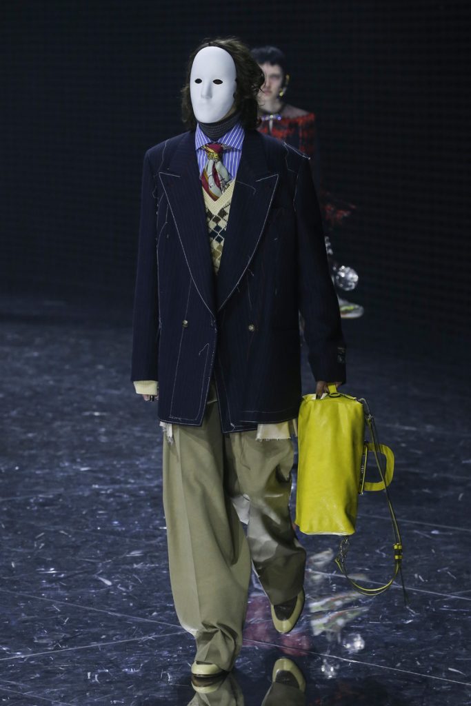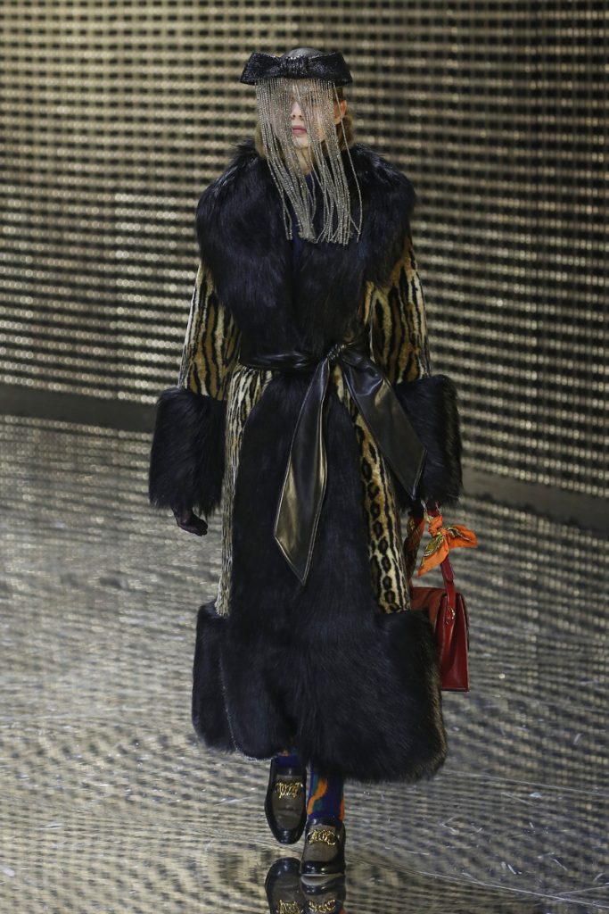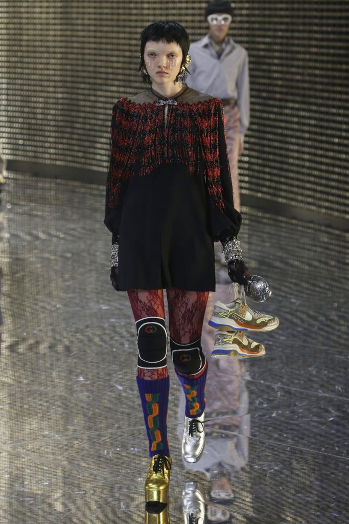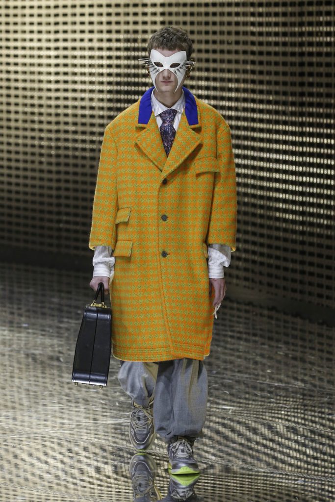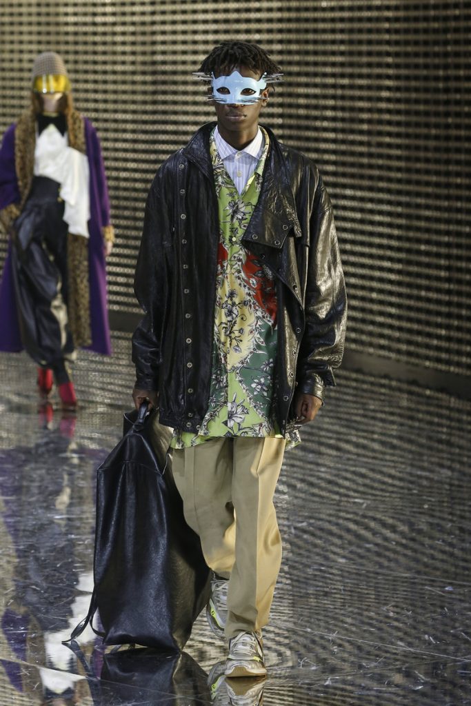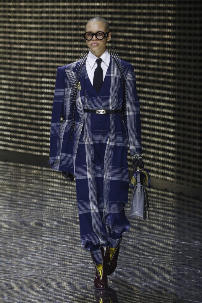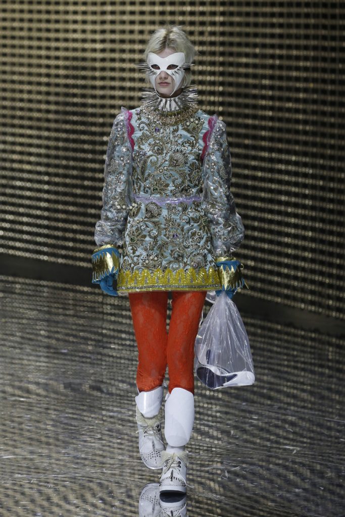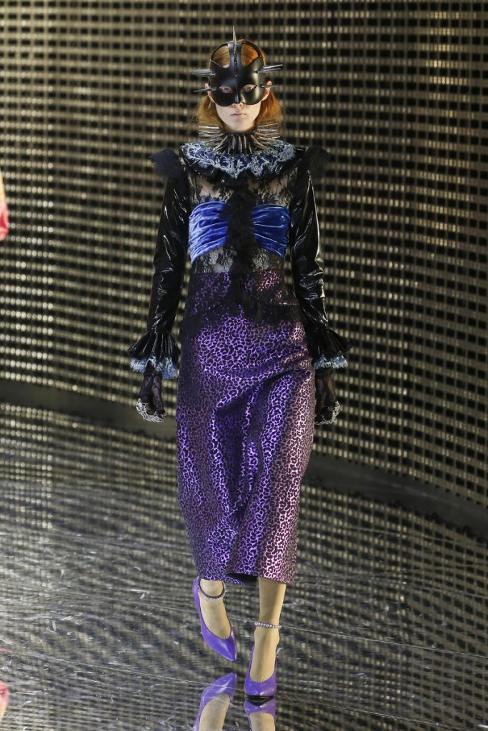 Over 120,000 LED light bulbs filled the mirrored Gucci show area which endlessly reflected and refracted the lights. A kaleidoscopic backdrop to Alessandro Michele’s latest Gucci collection. Another bizarre parade of costume-y clothes and this time with an extra focus on face masks. . “If appearance represents the physiological conditions of our thinking of ourselves as persons in relation, masks can offer themselves as the means through which we can give citizenship rights to our manifold becoming,” read the show notes. And so models wore face masks with studs and spikes. Some of them also wore pieces of gold on their eyes and ears. As always lot of attention was put into the details. The belts, the scarfs, the bags, the knee pads, the necklaces, the tights, the ties (also for the girls), the (dog) collars with huge spikes. Models carried around their back-up sneakers in case their high heels got the best of them. The men wore oversized suits, the women wore lots of lace and dresses and tops with puffy shoulders and peplum details. Checks came in all forms; harlequin, pied de poule and tartan. Flowers prints, leopard prints and snake prints all found their way onto the runway. Towards the end Unia Pakhomova even rocked a print mix look and cloak fit for a queen. And if you’d skip all the grungy spikes and moody masks there were actually quite a lot of beautiful, wearable pieces in the collection. But you’d have to look through Michele’s more is more signature and perhaps take a closer look at the Gucci showroom tomorrow to be able to see these designs for what they really are. As far as this show’s concerned, this was yet another memorable Gucci spectacle.