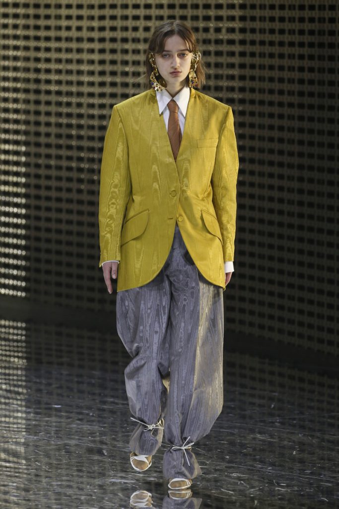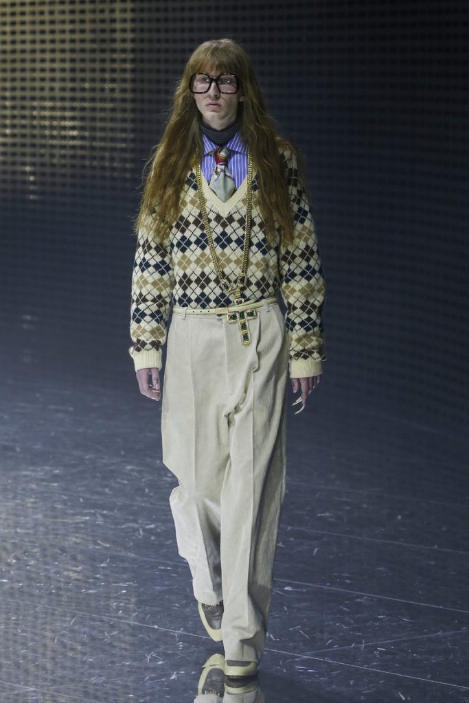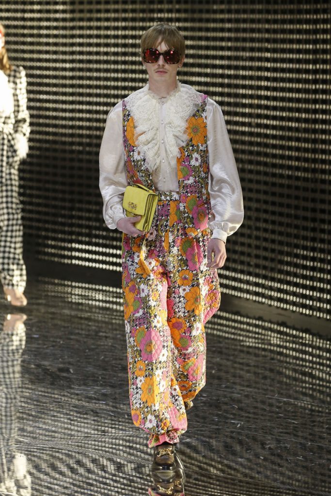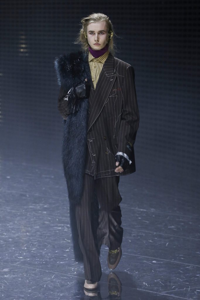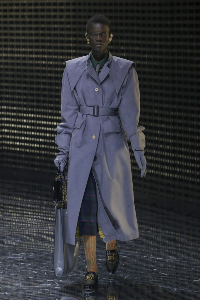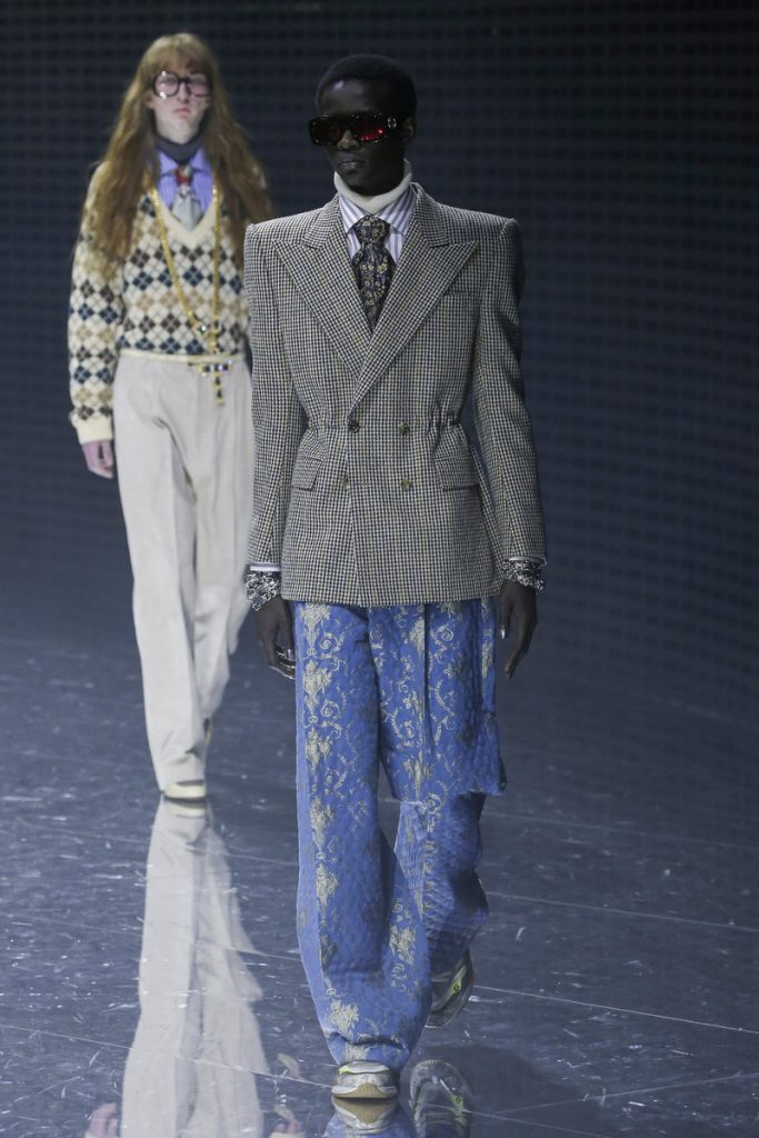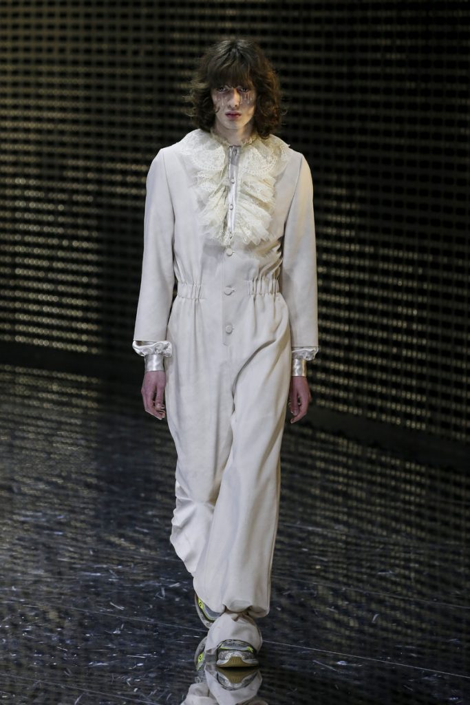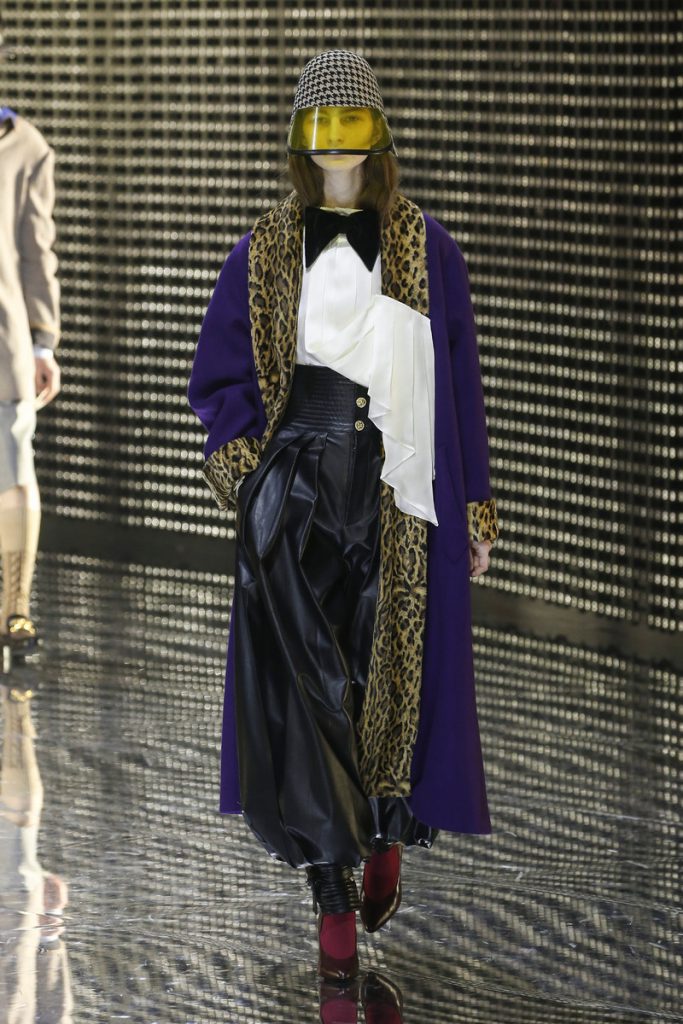 Over 120,000 LED light bulbs filled the mirrored Gucci show area which endlessly reflected and refracted the lights. A kaleidoscopic backdrop to Alessandro Michele’s latest Gucci collection. Another bizarre parade of costume-y clothes and this time with an extra focus on face masks. . “If appearance represents the physiological conditions of our thinking of ourselves as persons in relation, masks can offer themselves as the means through which we can give citizenship rights to our manifold becoming,” read the show notes. And so models wore face masks with studs and spikes. Some of them also wore pieces of gold on their eyes and ears. As always lot of attention was put into the details. The belts, the scarfs, the bags, the knee pads, the necklaces, the tights, the ties (also for the girls), the (dog) collars with huge spikes. Models carried around their back-up sneakers in case their high heels got the best of them. The men wore oversized suits, the women wore lots of lace and dresses and tops with puffy shoulders and peplum details. Checks came in all forms; harlequin, pied de poule and tartan. Flowers prints, leopard prints and snake prints all found their way onto the runway. Towards the end Unia Pakhomova even rocked a print mix look and cloak fit for a queen. And if you’d skip all the grungy spikes and moody masks there were actually quite a lot of beautiful, wearable pieces in the collection. But you’d have to look through Michele’s more is more signature and perhaps take a closer look at the Gucci showroom tomorrow to be able to see these designs for what they really are. As far as this show’s concerned, this was yet another memorable Gucci spectacle.