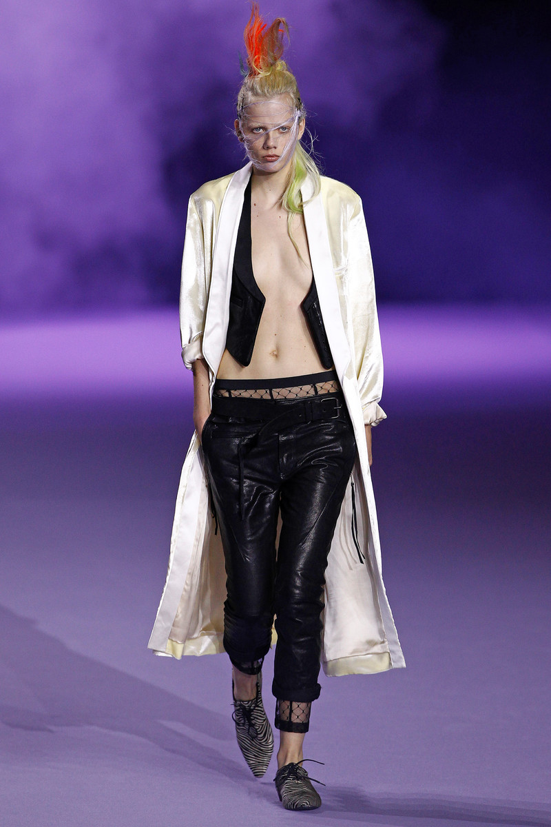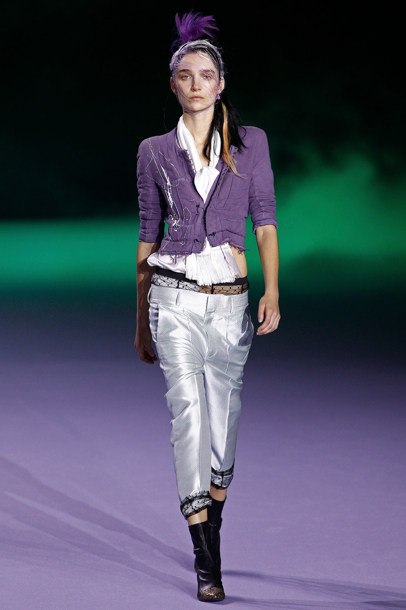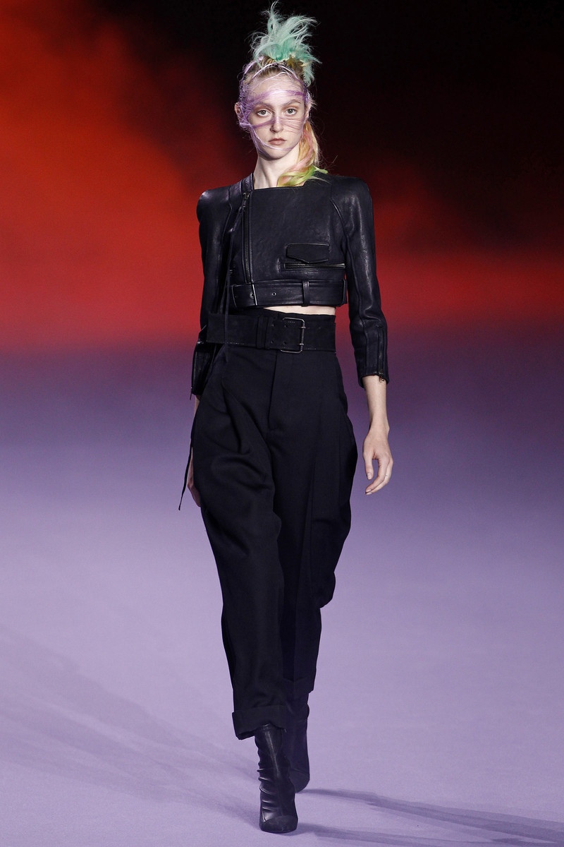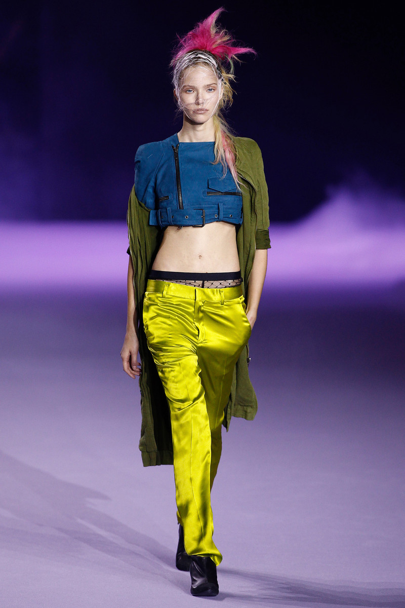 If punk ever had a soft side, Haider Ackermann showed us all how it would look like. Starting with the models’ hair that had touches of the brightest sky blue, anise green, orange, pink, and lavender strands, attached with safety pins. Colored hair is still a big trend in the land of bloggers and showbiz, so score! As bright as the models locks, as bright colored were the lighting and the clothing. Ackermann’s birds of paradise featured strong statement looks (“for a strange world” as the designer stated) in a range of rainbow-y shades styled off with black. Like a pair of fringed pastel yellow pants worn with a velvet mint green jacket and zebra shoes. Or a pair of bright (almost luminescent) yellow pants paired with a cropped blue biker jacket and a army green overcoat. Pieces of polka dot lace, fringes and ruffles in the mix. Details that added to the soft side of the collection as heavy leather and shiny silk, chiffon blouses and low slung pants formed the ultimate balance. Styling twists like tucked up tuxedo sleeves, touches of sheerness and nudity, velvet belts, pointy boots and fringed scarfs added to the coolness of the looks. Let bright colored troll hair and matching velvet tuxedo jackets be next summer’s dresscode!