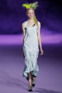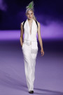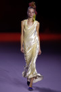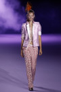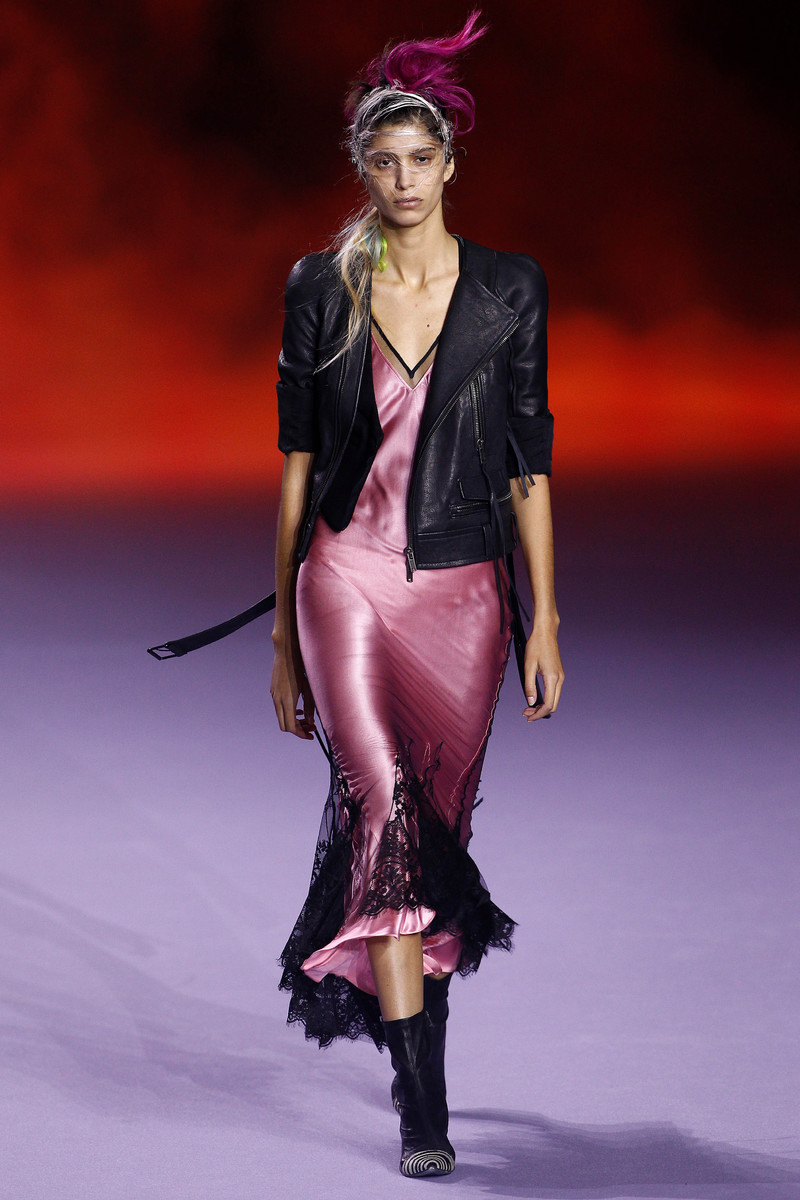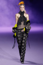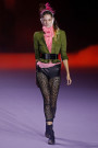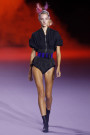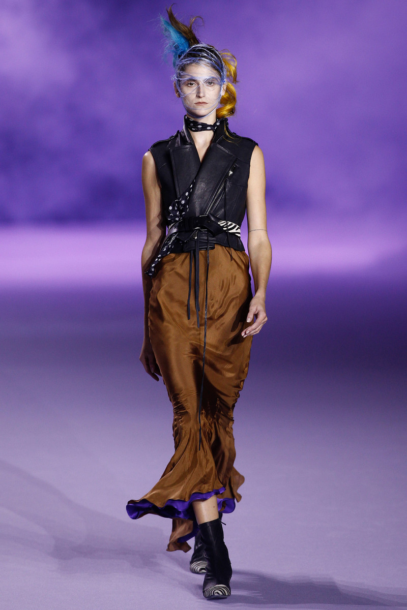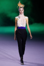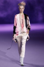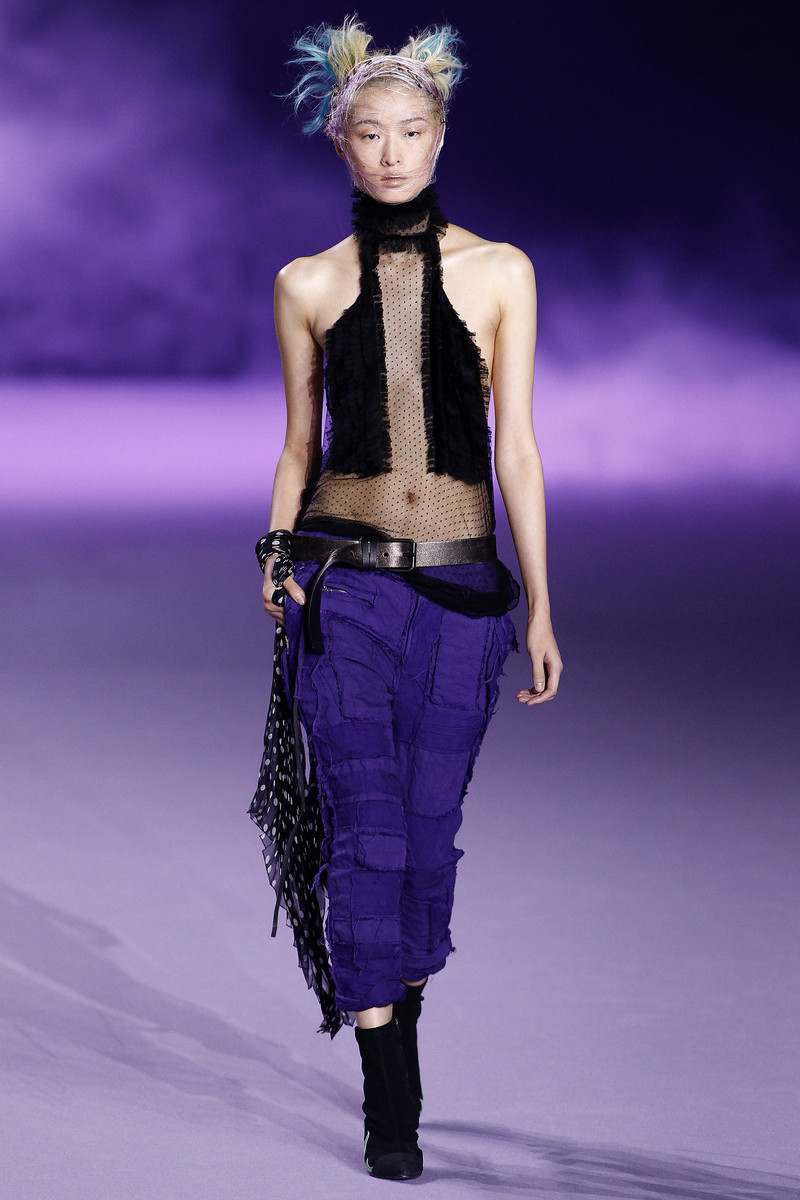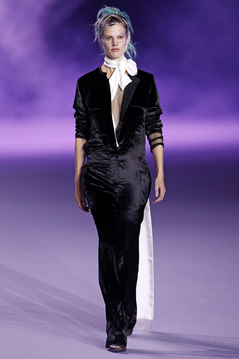 If punk ever had a soft side, Haider Ackermann showed us all how it would look like. Starting with the models’ hair that had touches of the brightest sky blue, anise green, orange, pink, and lavender strands, attached with safety pins. Colored hair is still a big trend in the land of bloggers and showbiz, so score! As bright as the models locks, as bright colored were the lighting and the clothing. Ackermann’s birds of paradise featured strong statement looks (“for a strange world” as the designer stated) in a range of rainbow-y shades styled off with black. Like a pair of fringed pastel yellow pants worn with a velvet mint green jacket and zebra shoes. Or a pair of bright (almost luminescent) yellow pants paired with a cropped blue biker jacket and a army green overcoat. Pieces of polka dot lace, fringes and ruffles in the mix. Details that added to the soft side of the collection as heavy leather and shiny silk, chiffon blouses and low slung pants formed the ultimate balance. Styling twists like tucked up tuxedo sleeves, touches of sheerness and nudity, velvet belts, pointy boots and fringed scarfs added to the coolness of the looks. Let bright colored troll hair and matching velvet tuxedo jackets be next summer’s dresscode!