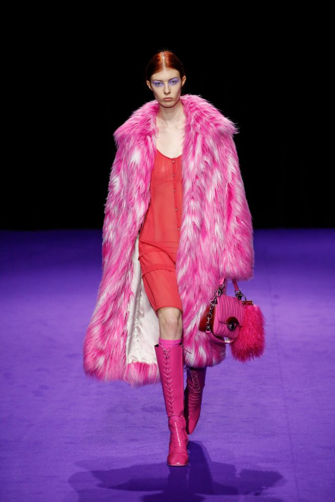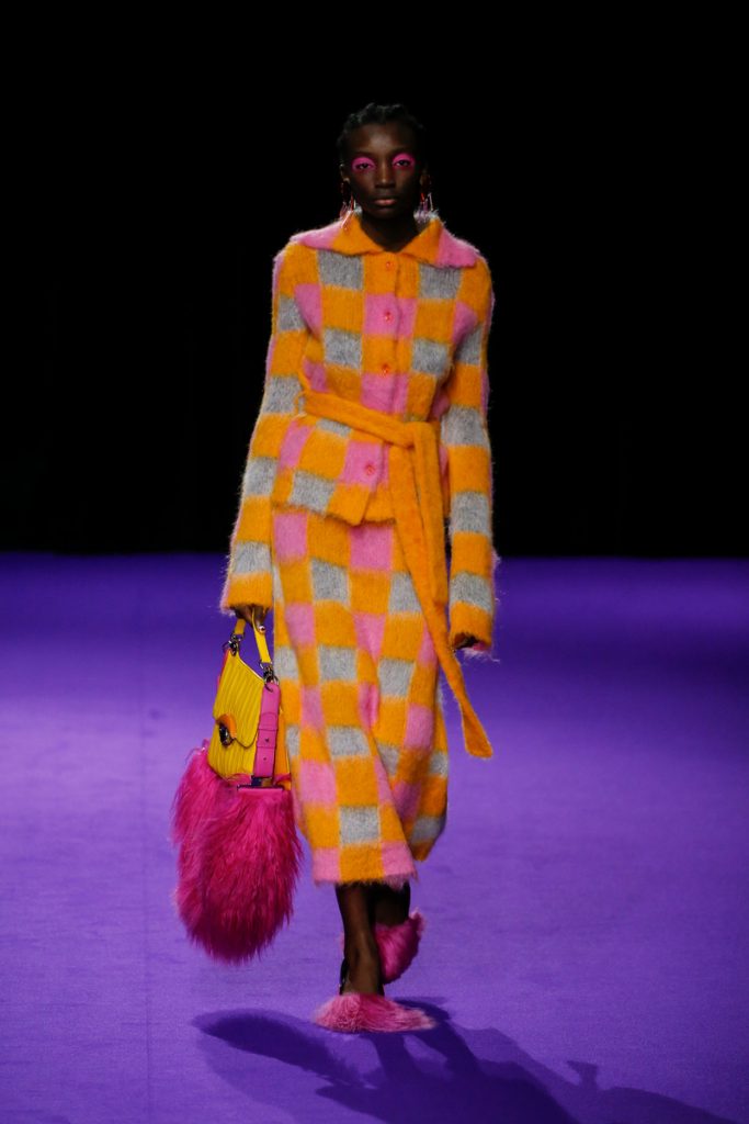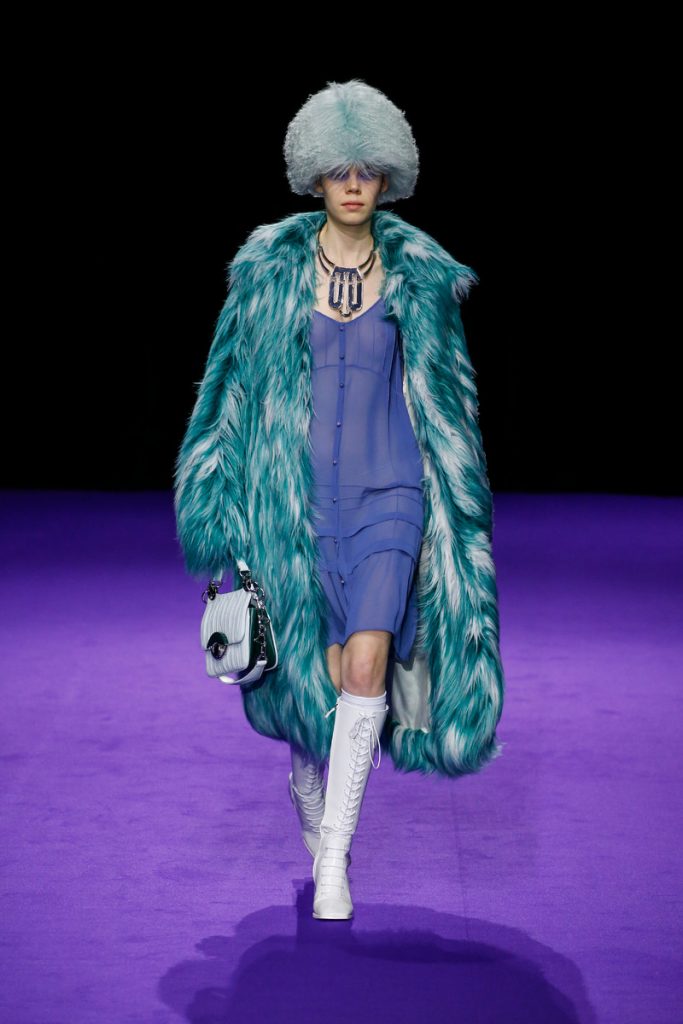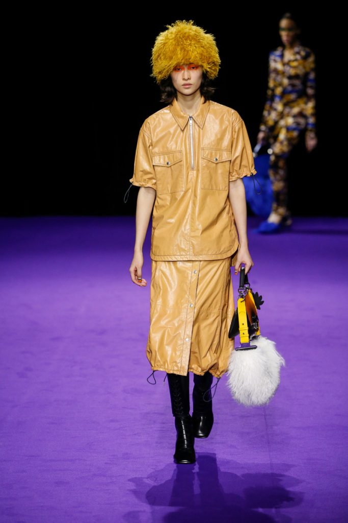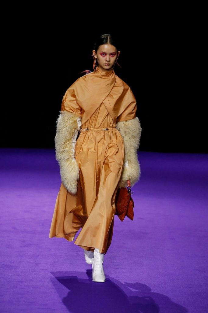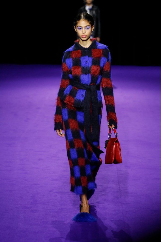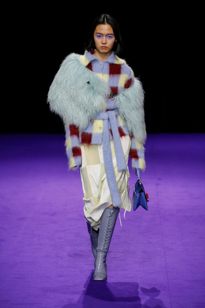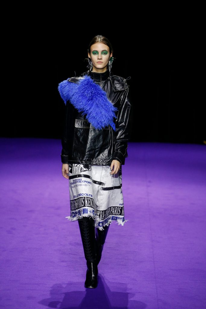 Influences from Humberto Leon’s father’s Chinese-Peruvian heritage started off the theme for Kenzo’s fw2019 collection. It made up for the traditional garments which were given a modern touch. The show kicked off with the most stunning look of all; an army green coat with turquoise colored fur touches (which made the purple eye shadow look even more stunning). The faux fur remained a theme throughout the show. It popped up in the shape of coats, hats (that looked like wigs at some point), sleeves, gloves, bags, stoles and even a checked fur skirts and tops in red and blue. The palette existed of bright pinks, orange, yellow and blue (with bright eyeshadow shades to match!). They were used in dazzling prints and statement accessories. From denim boiler suits to knitted poncho’s; we’re not exactly sure how to interpreted this fw2019 Kenzo collection. But there’s lots to love for the woman who dares to make that statement.