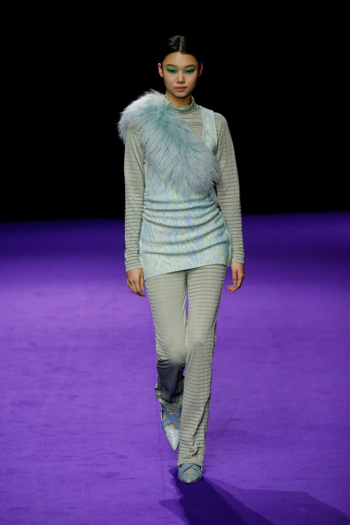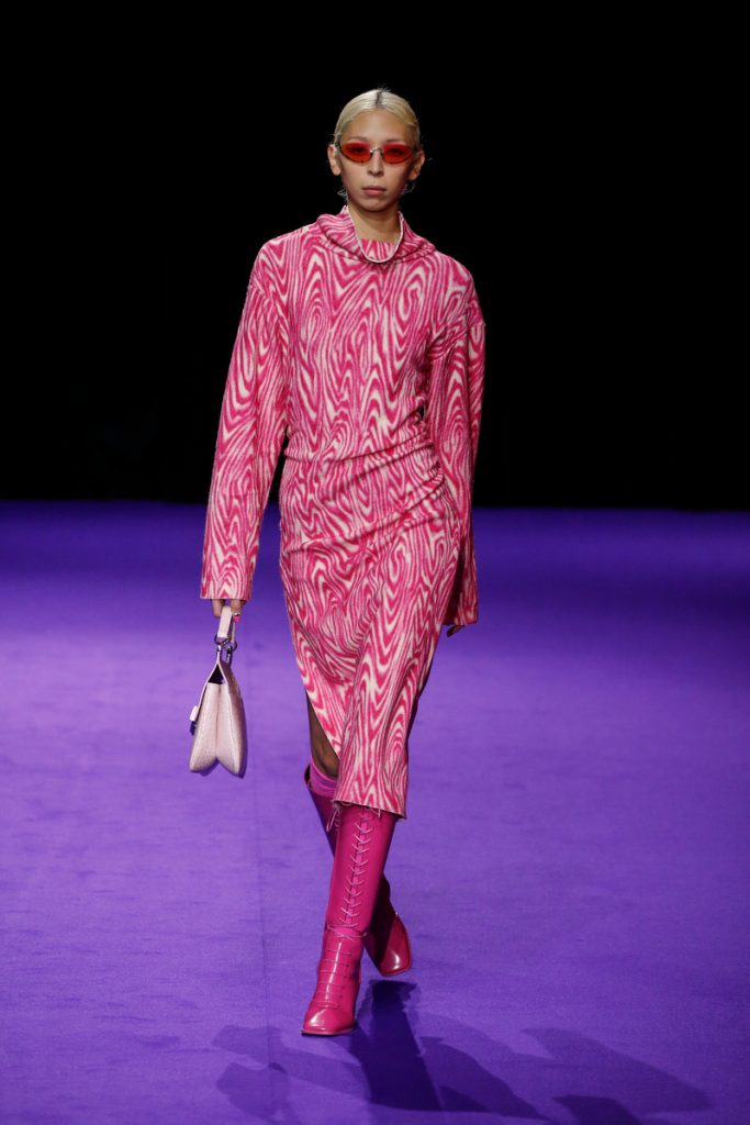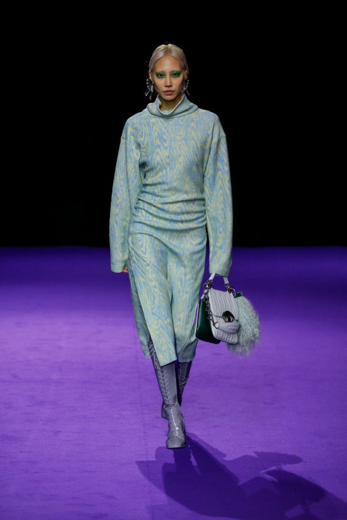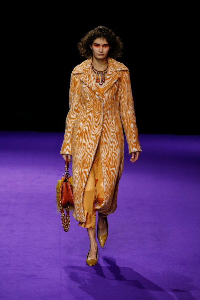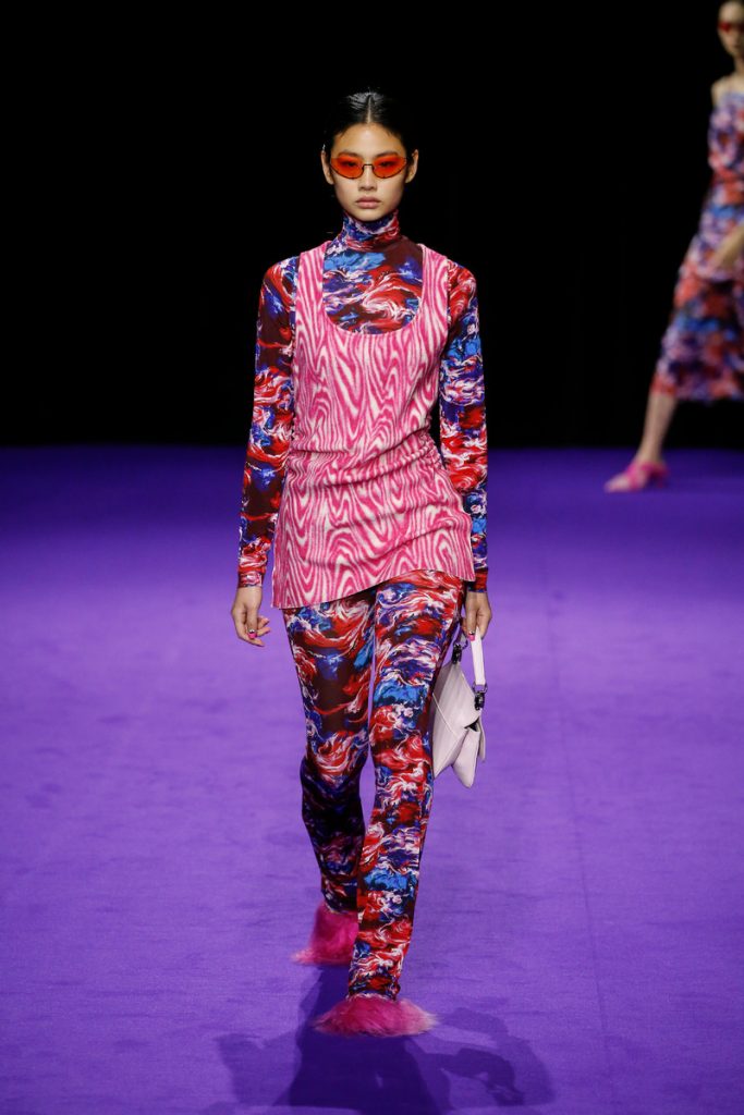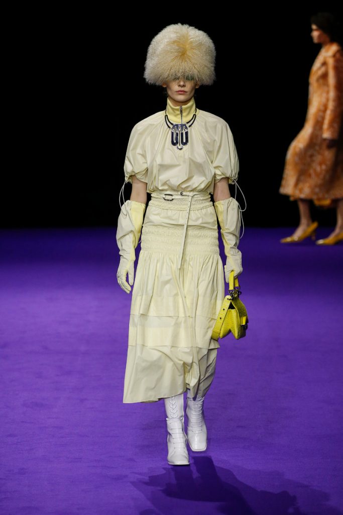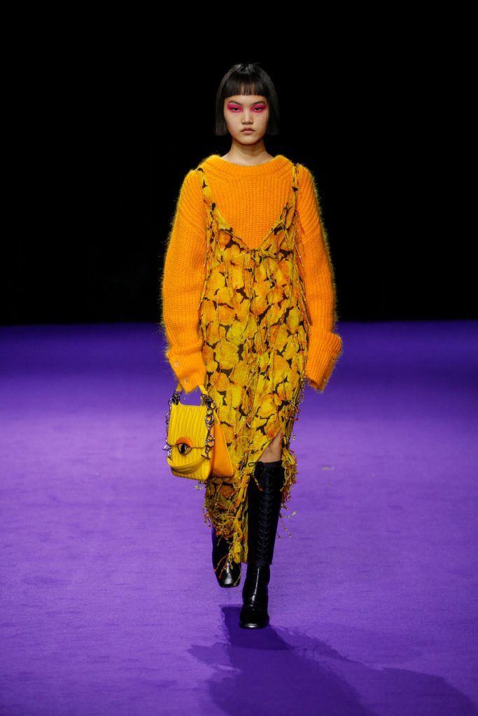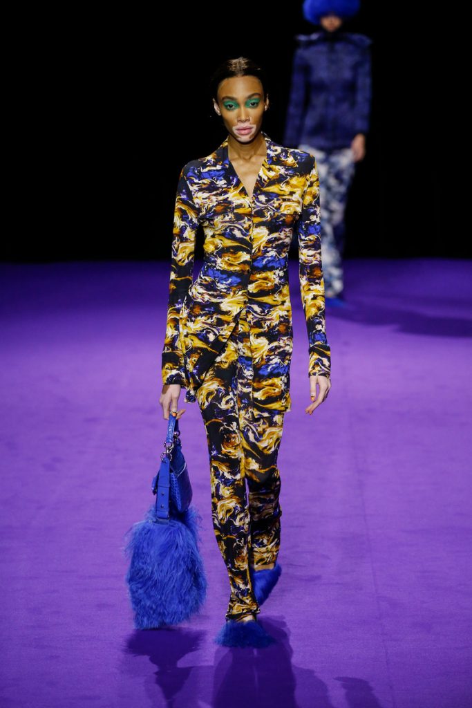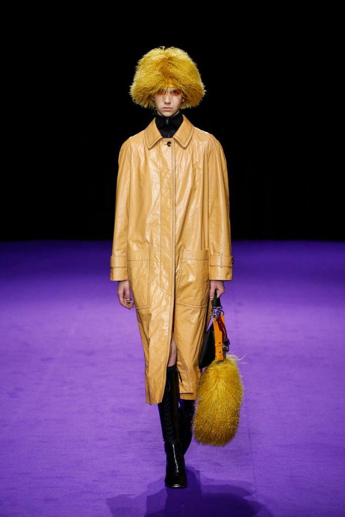 Influences from Humberto Leon’s father’s Chinese-Peruvian heritage started off the theme for Kenzo’s fw2019 collection. It made up for the traditional garments which were given a modern touch. The show kicked off with the most stunning look of all; an army green coat with turquoise colored fur touches (which made the purple eye shadow look even more stunning). The faux fur remained a theme throughout the show. It popped up in the shape of coats, hats (that looked like wigs at some point), sleeves, gloves, bags, stoles and even a checked fur skirts and tops in red and blue. The palette existed of bright pinks, orange, yellow and blue (with bright eyeshadow shades to match!). They were used in dazzling prints and statement accessories. From denim boiler suits to knitted poncho’s; we’re not exactly sure how to interpreted this fw2019 Kenzo collection. But there’s lots to love for the woman who dares to make that statement.