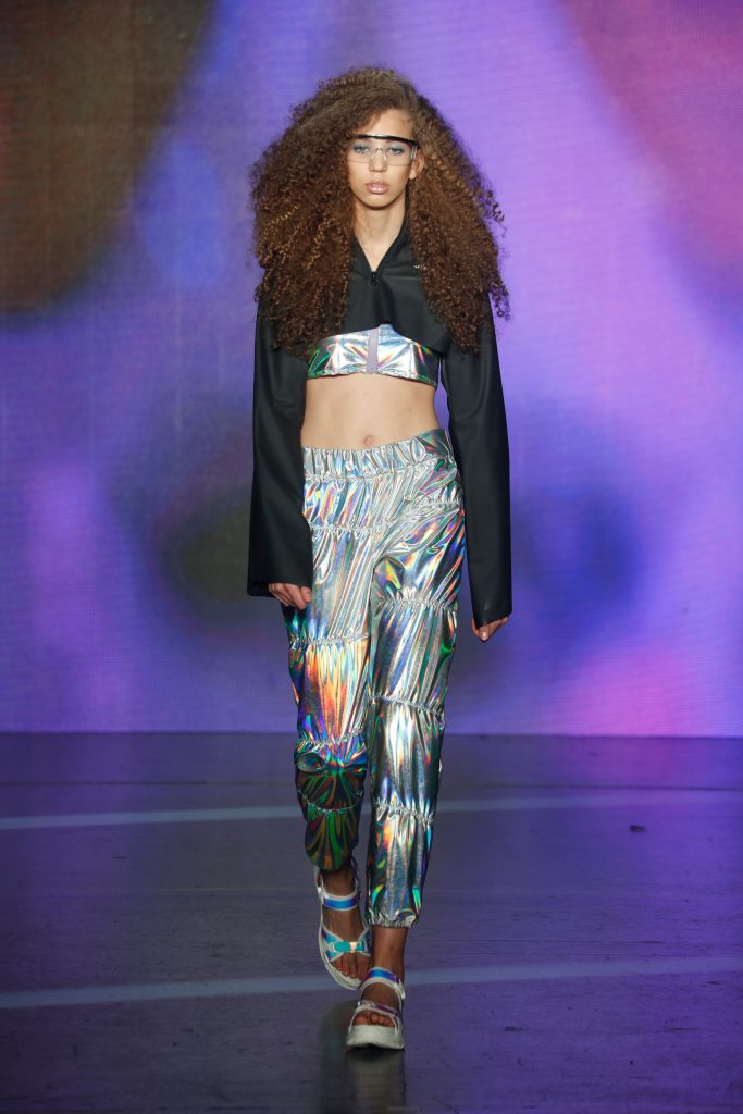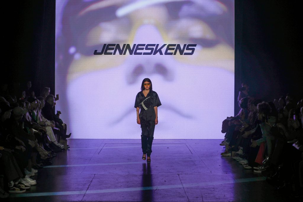 Two young, urban streetwear labels made up for a cool Saturday afternoon program. First up was Jenneskens (who debuted during last years Amsterdam Fashion Week) and her tough n sporty collection of mens and womenswear looks. In the opening video we saw rapper Famke Louise wearing the label’s clothes. Models sported large colored glasses, fanny packs and a mix of sporty sneakers and open heels. Their wardrobe existed of a slouchy silk suit, metallic pants and cropped tops, casual sweaters with the label’s logo on it, sheer (water proof) pants, biker shorts, jackets with xl pockets, patent leather pants and jumpsuits. Famke Louise closed the show in a silver metallic belted coat.