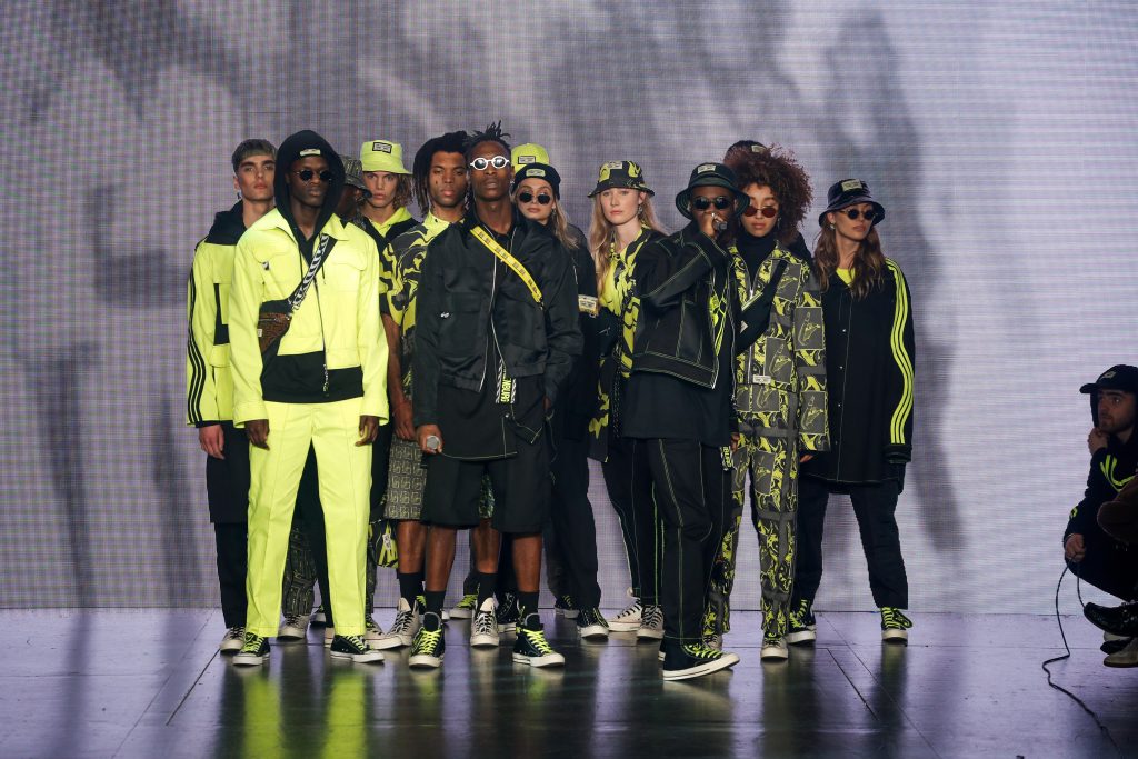 After than it was onto Sterkenburg and her own little rapper scene. Models looked cool and collected. They sported black and neon looks. Busy prints all over, three stripes on the sleeves. Oversized coats, trainer and denim jackets, hats, beanies, caps, sunglasses and fanny packs here too. After all looks were shown one of the models turned out to be a rapper. So a little performance was started out on the runway. A perfect fit to the show.